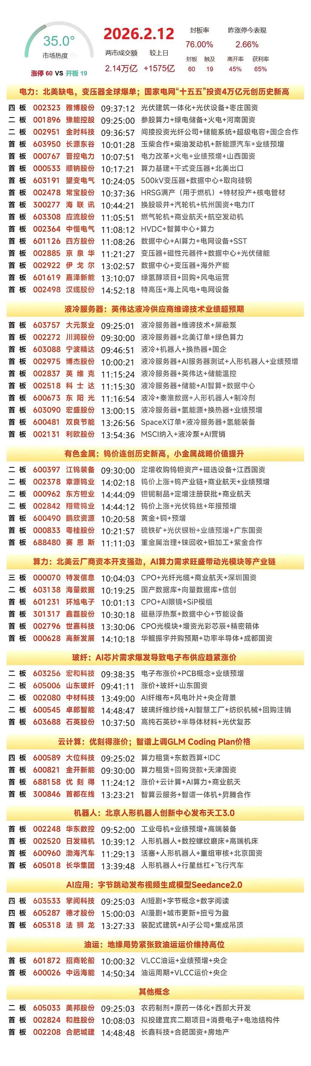 2月12日复盘:利欧股份、大位科、掌阅科技、特发信息、首都在线隔日走势的一些看法! 1、利欧股份(液冷+AI应用) 液冷方向早盘迎来利好,开盘后整个板块出现了非常强势的表现,持续回调的利欧在早盘出现了明显的异动拉升,但是它冲高后却是明显的回落走势,毕竟它之前很少跟随液冷方向走出来,之后就是长时间的高位横盘,午后出现资金强势做多封板,封板资金一度达到43亿,最终走出了一个底部反转的涨停形态! 盘后的龙虎榜买盘万豪世家、中泰湖北分、佛山系和知春路都是知名游资席位,卖盘整体抛压并不大,这样的榜单是非常亮眼的,而且利欧每次启动都会有一波不错的表现,所以它每次涨停后人气值都会飙升,而且今天算是它持续回调后的首板,从情绪上是大概率走出持续性的,但是现阶段市场连板情绪较差,而且板块的持续性是存疑的,所以隔日利欧连板概率其实并不大,除非市场短线情绪转暖,液冷方向或者AI方向走出持续强势表现! 2、大位科技(云计算) 优刻得涨价,算力方向继续有强势表现,所以大位早盘竞价一字有继续加强,早盘开盘封单仍然有23亿,甚至超过了掌阅,所以它继续强势一字晋级就毫无悬念了,而在它的强势带动下,整个算力方向继续走出非常强势的板块行情! 盘后的龙虎榜是3日榜,结合昨日榜单看,量化太华路排板买入9千万,江苏路、思明南路同样是排板买入,卖盘整体抛压并不大,相比于昨天出现了一定分歧,今天大位的表现是更强的,隔日竞价一字板几乎没有悬念,但是近期5板是一个坎,今天4连板的4只肯定存在竞争,4只个股代表着市场的3个方向,隔日就是面临竞争,从强度上看,今天大位是最强势的,隔日从情绪上占据心理优势,而且算力后排相对比较多,走出晋级应该是大概率的,所以隔日它更多的是可以关注板上分歧的买点,毕竟算是明显的板块龙一,从情绪上分歧的情况下会有足够资金去承接,特别是竞价能够开出一字的情况下! 3、掌阅科技(AI漫剧) 掌阅竞价继续强势一字板,虽然开盘的封单比昨天要少,但是资金强势承接做多的决心非常足,并且在博纳情绪负反馈的影响下并没有炸板,最终还是强势一字板晋级! 掌阅已经连续4个一字板了,这样的表现在曾经的脑机接口创新身上出现过,而且今天它虽然是一字板,但是只要是排的隔夜单,排到的概率是非常大的,而且4个亿的成交额也是继续在放量,隔日出现开板无悬念,但是从情绪上看,AI漫剧连续两天大幅调整,隔日板块出现修复的概率非常大,那么掌阅开板后的承接肯定会非常强,毕竟它是这个方向的绝对龙一,这是市场龙头选手的最佳选择,而且正值春节,AI漫剧跨越春节前后的行情会是大概率,掌阅作为主板最强势的个股,之后走出换手板晋级的概率是非常大的,所以虽然它今天涨停强度不如大位,但是从题材的强度看,掌阅可能会更占优势! 4、特发信息(算力) 特发竞价也是一字开盘,但是开盘后却出现了明显的资金砸盘兑现,盘中虽然下跌过程中支撑明显,但是始终没有资金回封,直到10点才出现强承接回封,最终走出了一个高位的放量T字板晋级! 盘后的龙虎榜看机构做T明显,太华路这个量化也开始做T,所以从情绪上看今天虽然是放出了大量,但是整体做多资金并没有变化,从昨日的三日榜看,之前介入的多个游资多数没有完全清仓走人,格局的概率还是比较大的,毕竟大位足够强的一字,对于它是有助攻的,但是从情绪上看,特发就是一个龙二,想要走出卡位很难,毕竟大位已经4板,辨识度不是二板能比的,这样的身位压制一般不会轻易改变,所以也就很难出现特发晋级大位断板的走势,对于特发来说,大位开盘的反馈就是重点了,很多资金都是喜欢看A买B,如果大位不给机会,板块情绪还在,特发就是资金的最好选择,隔日特发能不能走出来,就看大位能不能继续情绪一字,而算力整体的强度能不能持续也是一大看点,毕竟一旦板块大分歧,就很可能出现类似AI漫剧欢瑞、博纳的惨案! 5、首都在线(云计算) 优刻得涨价,智谱上调GLM价格,这对于整个云计算方向是有明显带动的,所以大位走出了更强的一字板,港股智谱也是大幅上涨,首都也是高开后跟随港股智谱走出了超强表现,并且在午后港股智谱持续大涨时去封板,最终走出了一个明显强势的突破涨停! 盘后的龙虎榜方新侠买入1.5亿,玉兰路7千万,太华路和上海陆家嘴两个量化也有买入,卖盘作手新一、锦康路止盈,两个机构做T,这样的榜单整体还是非常不错的,今天首都的走势完全是对标港股的智谱,所以港股智谱隔日开盘能否有持续表现可以当成这只个股的参照物,从情绪上看,近期20cm连板其实很难的,首都从表现上看应该很难连板,但是从近期智谱的强势表现看,首都的趋势还是可以重点关注的,也许明天断板后会有一段趋势行情! 本文只限于分享和交流,不构成投资建议,股市有风险,投资需谨慎!
