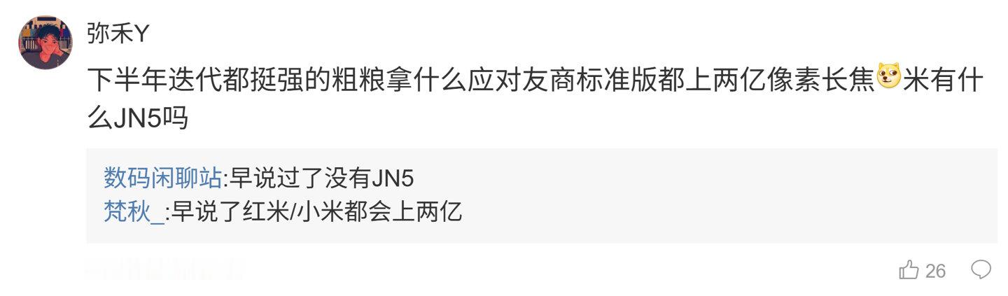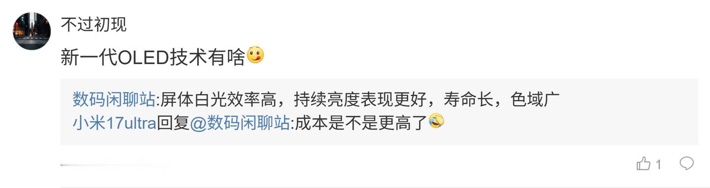 后续有用户在评论区询问:“下半年迭代都挺强的粗粮拿什么应对友商标准版都上两亿像素长焦  米有什么 JN5 吗”,博主回复道:“早说过了没有 JN5”;另一名用户则询问道:“新一代 OLED 技术有啥”,博主则回复道:“屏体白光效率高,持续亮度表现更好,寿命长,色域广”。