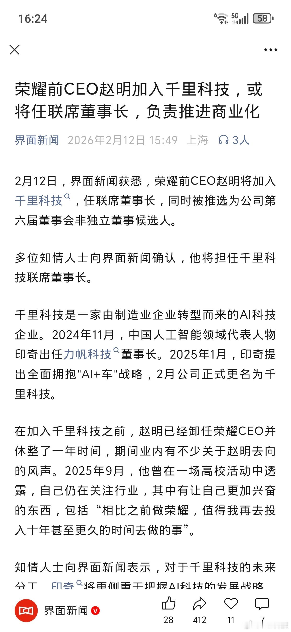 速报:赵明已加入千里科技,担任联席董事长及董事会非独立董事候选人,主要负责推进公司AI技术的商业化闭环,特别是围绕“AI+车”战略的商业模式落地。他将与董事长印奇形成互补,印奇侧重AI技术战略,赵明则依托其在消费电子领域的经验,主导资源整合与商业变现,又一家前手机高管去做汽车了 赵明将出任千里科技联席董事长 赵明回应加盟千里科技
