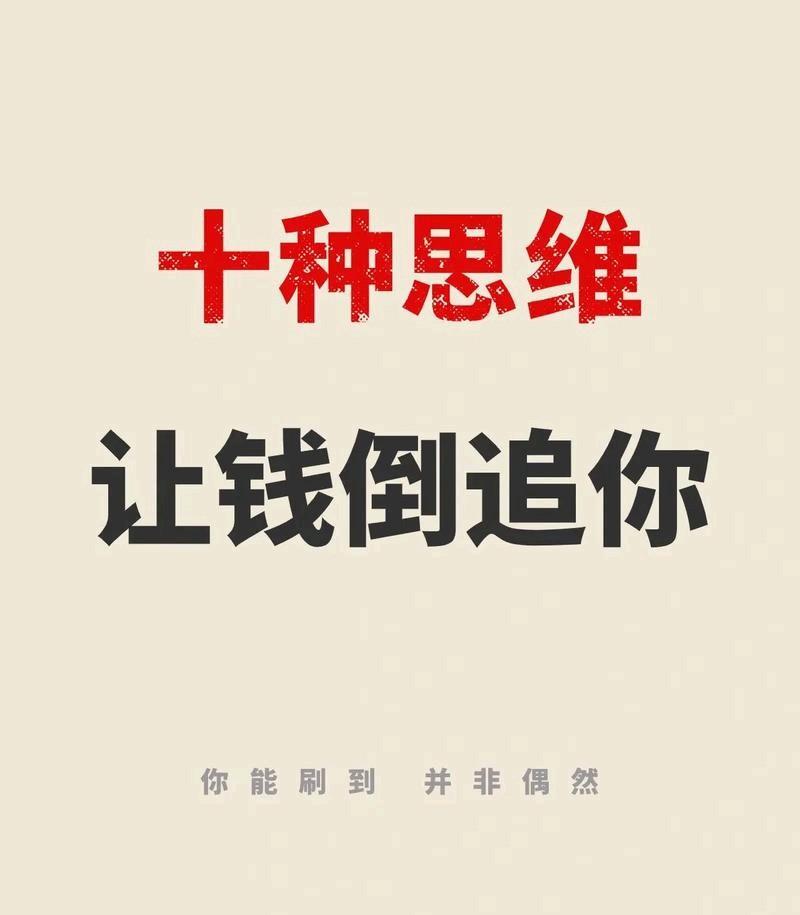 我发现,真正厉害的人都吃透了这顶级赚钱思维10条 想要真正赚到钱,核心就是:抓风口、懂价值、守底线、强自己、重结果,不内耗、不瞎忙,用对思路比盲目努力更重要,具体如下: 1. 抓住短期风口,就能改命。 2. 持续深耕,坚持就有机会。 3. 顺境留后路,不恋战才长久。 4. 打工难自由,赚钱靠价值。 5. 解决问题、不可替代,才会值钱。 6. 靠近赚钱的人,人脉靠价值互换。 7. 扛起责任,为自己和家人赚钱。 8. 流量+信任,就是互联网财富。 9. 余额是底气,善良要有实力。 10. 放下面子,果断变通才能赚大钱。 人性本质就是趋利避害,做事果断、懂得变通的人更容易成事,满口仁义道德、心慈手软,只会处处碰壁。 你觉得哪一条最扎心、最实用?评论区聊聊,你在赚钱路上最缺的是什么? (信息源于网络,个人观点,仅供参考) 点亮〔收藏和赞〕让钱和健康都流向你
