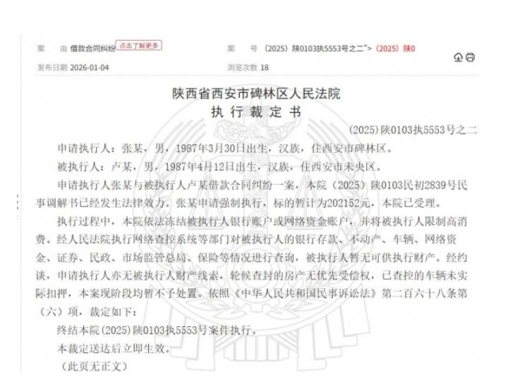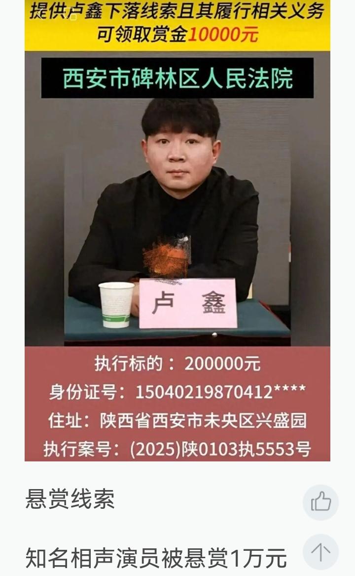 春晚名人也不值钱了!听说没?卢鑫把张玉浩告了——哦不对,是张玉浩把卢鑫给悬赏了(详见附图)! 西安碑林区法院刚发了个公告,俩相声演员,卢鑫玉浩,台上逗哏捧哏多少年,现在好了,一个当申请人,一个当被执行人。执行标的:20万。就20万,不是200万,更不是2000万。张玉浩愣是掏钱发悬赏,满世界找卢鑫。 这剧情,比他们说的任何一段相声都荒诞。 咱就说,卢鑫啊,你好歹也是上过春晚、开过专场、被叫过“相声新势力”领军人物的腕儿,怎么就让20万给逼得“失联”了?是去深山老林琢磨新包袱了,还是怕债主堵后台不敢串场了? 说真的,20万在相声圈算啥?商演一场的零头,直播间挂小黄车一周的事。结果呢,嘴皮子再溜,愣是没把这20万说没。当年台上砸挂拿搭档开涮,台下借钱拿搭档当真,这现挂砸得,有点疼啊。 玉浩这边也是真急眼了。相声讲究“三分逗七分捧”,这回他是铁了心要把这七分捧的钱要回来。昔日台上一块板,如今法院两行文,曾经张口闭口“我搭档”,现在只剩悬赏公告上冷冰冰俩名字。 所以说,搭档再好,账得算好。台上砸挂是艺术,台下赖账是事故。 你们说,这20万到底是咋欠的——是演出费没分匀,还是真金白银借的?搭档之间借钱,该不该打借条?