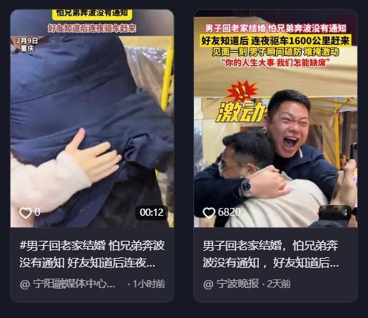 “看哭了!”重庆男子回老家结婚,因路途遥远怕麻烦好友就没有通知他们,不料,婚礼前一晚,好友竟驱车1600公里出现在他面前,男子喜极而泣,激动大喊! 一辆沾满灰尘的轿车熄火在重庆某个偏远村落的夜色里,引擎盖还散发着长途奔袭后的余热。 这里没有鲜花拱门,没有红毯聚光灯,只有车门打开那一刻,几双沾着泥点的鞋子踏在了水泥地上。 这是2月8日,一场婚礼的前夜。就在几个小时前,这群来自天南地北的年轻人做了一个完全违背现代经济理性的决定:驾驶车辆,轮流换手,不分昼夜地狂飙1600公里。他们的目标,是一个试图对他们“隐身”的新郎。 把镜头拉近到那间老屋门口。作为这次突袭的主角,那位重庆新郎此时正对着第二天繁琐的婚礼流程单发愁。在他的逻辑里,这是一场并不完美的“自我消化”为了省事,也是为了体面,他启动了当代年轻人最流行的“静音模式”。 没有请柬,没有通知,不给兄弟们添麻烦。毕竟在大家都要计算年假余额和出行成本的今天,让朋友为了吃顿饭奔波千里,显得太不懂事了。 就在他眉头紧锁的时候,变故发生了。并不是那种温情脉脉的敲门声。一个穿着白衣的身影突然从人群缝隙中窜出,带着某种蓄谋已久的“攻击性”,猛地跳上了他的后背,紧接着一双大手死死蒙住了他的眼睛。 这是一个极具冒犯性的社交动作。在成人的安全距离法则里,这通常意味着危险。新郎的第一反应是生理性的排斥,他难受地扭动身体,试图甩开这个不知轻重的“捣乱者”。 直到他恼怒地转身,视线从模糊变得清晰。那一瞬间,他的大脑出现了长达数秒的宕机。站在他面前的,是那几张熟悉到骨子里的脸。他们风尘仆仆,眼底挂着熬夜赶路的红血丝,手里提着甚至有些随意的简单伴手礼。 刚才还满脸不耐烦的新郎,表情瞬间从惊愕坍塌成了一种失控的扭曲。他张了张嘴,喉咙里像是塞了一团棉花,半个字都吐不出来。 紧接着,眼泪夺眶而出。他一边胡乱地抹着脸,一边用力拍打着对方的肩膀,嘴里骂骂咧咧:“你们这群傻子,怎么来了!怎么不讲一声!” 这句“傻子”,大概是中文语境里最高级的赞美。在这场并不宽敞的乡村小屋里,所有的社交礼仪都被扔到了门外。没有人关心那个还没核对完的婚礼流程,也没有人计较自己是不是不请自来的“闯入者”。 几个大男人挤在一起,桌上只有最廉价的花生米和散装白酒。但当酒杯撞在一起的时候,空气里弥漫的不是客套的寒暄,而是某种久违的、粗糙的真实感。 他们聊起当年在学校翻墙去网吧的狼狈,聊起初入社会时互相借钱度日的窘迫。那些被时间和距离强行拉开的裂缝,在一顿并不丰盛的酒局里瞬间弥合。 这一幕之所以让无数围观者感到眼眶发酸,是因为它太过稀缺。翻开《2026年社交趋势报告》,我们看到的是一个被“精准计算”包裹的世界。数据显示,“搭子社交”已经成为绝对主流。我们有饭搭子、健身搭子、剧本杀搭子——这是一种极度高效的“需求交换”。 这种关系很安全,因为它是“日抛型”的。只要需求结束,大家就可以体面地互删或者躺列,谁也不用背负情感债。 相比之下,这几位朋友的行为简直是“反人类”的。从投入产出比来看,这是一笔亏本买卖:几千块的油费过路费,几十个小时的肉体疲惫,换来的不过是蹲在乡下吃一顿家常便饭。 按照中山大学学者裴谕新的研究,现代婚礼正在走向“三无”趋势——无接亲、无煽情、无负担。年轻人越来越害怕那种黏稠的人情往来,哪怕是喜事,也生怕变成了别人的累赘。 这位重庆新郎就是这种心态的典型样本。他小心翼翼地维护着成年人的边界感,却低估了“过命交情”的重量。 真正的朋友,从来不是用来“不麻烦”的。在那条长达1600公里的公路上,这群年轻人其实是在用轮胎和油耗,去对抗那个越来越冷漠的算法世界。他们用沾满泥巴的裤脚证明,在这个人均“点赞之交”的时代,依然有人愿意支付高昂的“情感溢价”。 那种感觉,就像是你以为自己只是一座孤岛,准备独自在这个喧嚣的时刻保持沉默。结果突然有一艘破破烂烂的小船,冒着风浪强行靠岸,船上的人跳下来冲你大喊:“想甩掉我们?门儿都没有。” 当晚深夜,老屋的灯光昏黄。新郎看着这群赖着不走的“傻子”,脸上挂着大概是这辈子最松弛的笑容。 这或许就是友谊的终极形态:它不讲究效率,不计算成本,甚至不需要一声“谢谢”。它只需要在你人生最重要的时刻,蛮不讲理地出现,然后陪你喝醉。