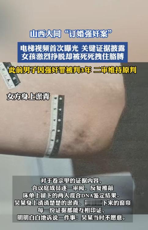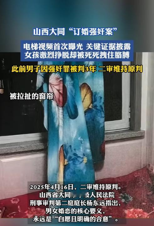 山西大同,男子订婚第2天,带女友看婚房,进屋后他突然要发生性关系,结果在遭到拒绝后,仍然霸王硬上弓,强行侵害了女友。 镜头定格在2023年5月2日的那个午后,大同某小区的电梯监控里,记录下了一帧令人窒息的画面。 一个女孩绝望地扒着电梯门框,手指因为用力而泛白,试图逃离那层楼。但下一秒,一只男性的手粗暴地将她拖回了黑暗深处。 如果不看卷宗,你很难想象,就在这这一幕发生的24小时前,这对男女刚刚举办了一场风光无限的订婚宴。 那时桌上摆着的,是男方席家郑重交付的10万元现金彩礼,还有一枚重达7.2克的金戒指。红纸黑字,喜气洋洋。 谁能想到,仅仅一天之后,那套90平米的婚房就从承诺幸福的港湾,变成了各种暴力痕迹斑驳的罪案现场。 事情的起因荒诞得像个黑色幽默。1996年出生的席某,显然把那场订婚宴当成了一笔“银货两讫”的买卖。 在他那个简单的逻辑闭环里,既然彩礼付了,戒指戴了,那眼前这个1999年出生的未婚妻,身体的使用权就已经发生了转移。 所以在5月2日那天,当他以“看婚房”为由把吴某骗进屋里时,压根没打算尊重女孩此前反复强调的“婚前不发生性行为”的底线。 门一关,那层温文尔雅的伪装瞬间就撕了下来。没有前戏,也没有温存,只有赤裸裸的要求和被拒绝后的恼羞成怒。 吴某显然是被吓懵了,她在这个封闭空间里,唯一的武器就是语言。她不停地喊着“等到结婚后”,试图唤醒对方的契约精神。 但在席某眼里,这些拒绝不仅刺耳,更像是一种毁约。既然你收了钱,现在装什么矜持?暴力的齿轮一旦转动,就很难停下。原本挂在窗边的窗帘被生生扯下半幅,女孩的手臂上很快浮现出指印形状的淤青。 这哪是未婚夫妻的亲热?这分明是捕猎者对猎物的围剿。为了求生,被反锁在屋里、手机被缴的吴某,做出了一个极其极端的举动她在绝望中点燃了卫生纸和客厅的窗帘。 试想一下,如果只是像席某后来辩解的那样是“情侣间的打情骂俏”,谁会拿身家性命去放火?这把火虽然没烧毁房子,但烧穿了席某最后一点谎言。正是利用他灭火的间隙,吴某才有了那一瞬间冲向电梯的机会。 也就是我们在开头看到的那一幕。虽然她当时被强行拖了回去,但这一段“数字证人”,成了后来定罪的关键铁证。 直到吴某母亲的电话打来,这场噩梦才算勉强暂停。拿到手机后的第一件事,女孩颤抖着拨通了110。 接下来的这一年多,是一场比案发当时更漫长的拉锯战。警方提取了床单上的DNA,锁定了那些被撕碎的布料和身体上的伤痕。 席某直到站在被告席上,依然觉得自己冤得不行。他的辩护词翻来覆去就一个意思:我们订婚了,给钱了,这怎么能算强奸?这种“金钱赎买一切”的傲慢,终于在法律面前撞得粉碎。 2025年4月16日,大同市中级人民法院给出了最终的答案:维持一审原判,有期徒刑三年。法官的法槌落得掷地有声:违背妇女意志就是强奸,彩礼不是性同意书,订婚也不是法律上的免罪金牌。 更讽刺的是,席某还在二审中反诉要求退还彩礼。法院这一回干脆利落驳回。这不仅是因为他在案发后拒绝了女方通过婚介所的退还,更是法律对这种“花钱买身”心态的降维打击。 如今已经是2026年了,席某正在高墙之内服刑。那10万元彩礼没能买来他想要的“权利”,反而成了他人生履历上最昂贵的一笔学费。 此桩案件宛如一柄锋利的手术刀,以其精准之态,将某些陈旧习俗中潜藏的弊病挑开,那些积弊如脓包般,在手术刀下无所遁形。它告诉所有人:在性自主权面前,一切所谓的“规矩”和“彩礼”,都必须让路。