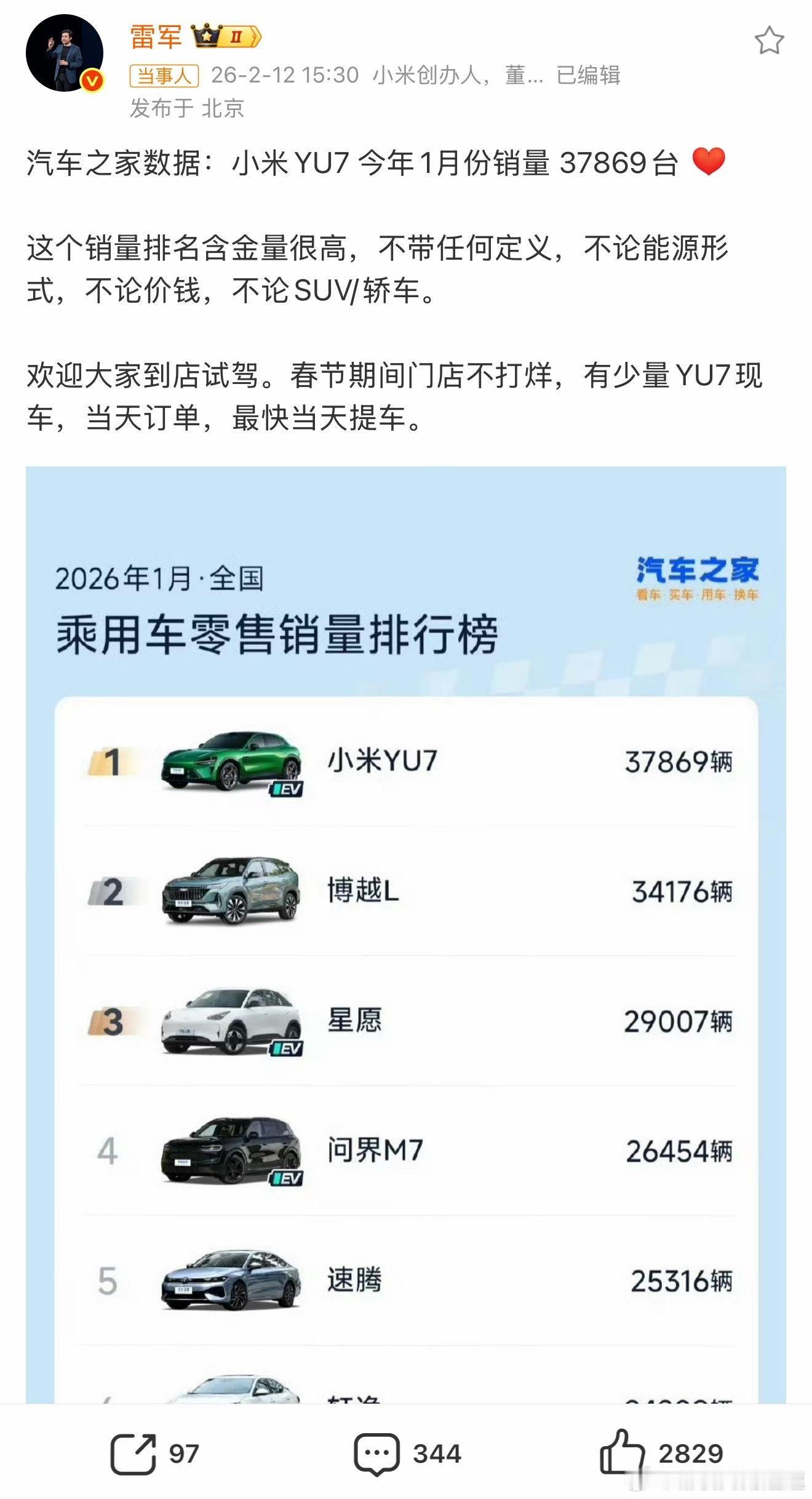 雷军回应YU7登1月销量榜首最近小区地库的YU7能见度越来越高了看来该买的都买到了