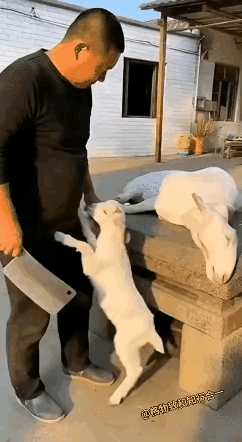 小羊跪求救母。 男子打晕母羊准备宰杀做羊肉汤。小羊跑过来抱着男人的大腿求情,男人犹豫不决,不杀母羊晚上吃啥?小羊锲而不舍,男子最终没有杀母羊。 刀下留情,万物皆有灵。小羊羔知道没有妈妈的痛苦和孤单,求主人不要杀害它妈妈,动物都知道救母,主人被小羊羔的行为软化了,终于放了羊妈妈。 善待动物尊重生命才是做人最起码的善良。