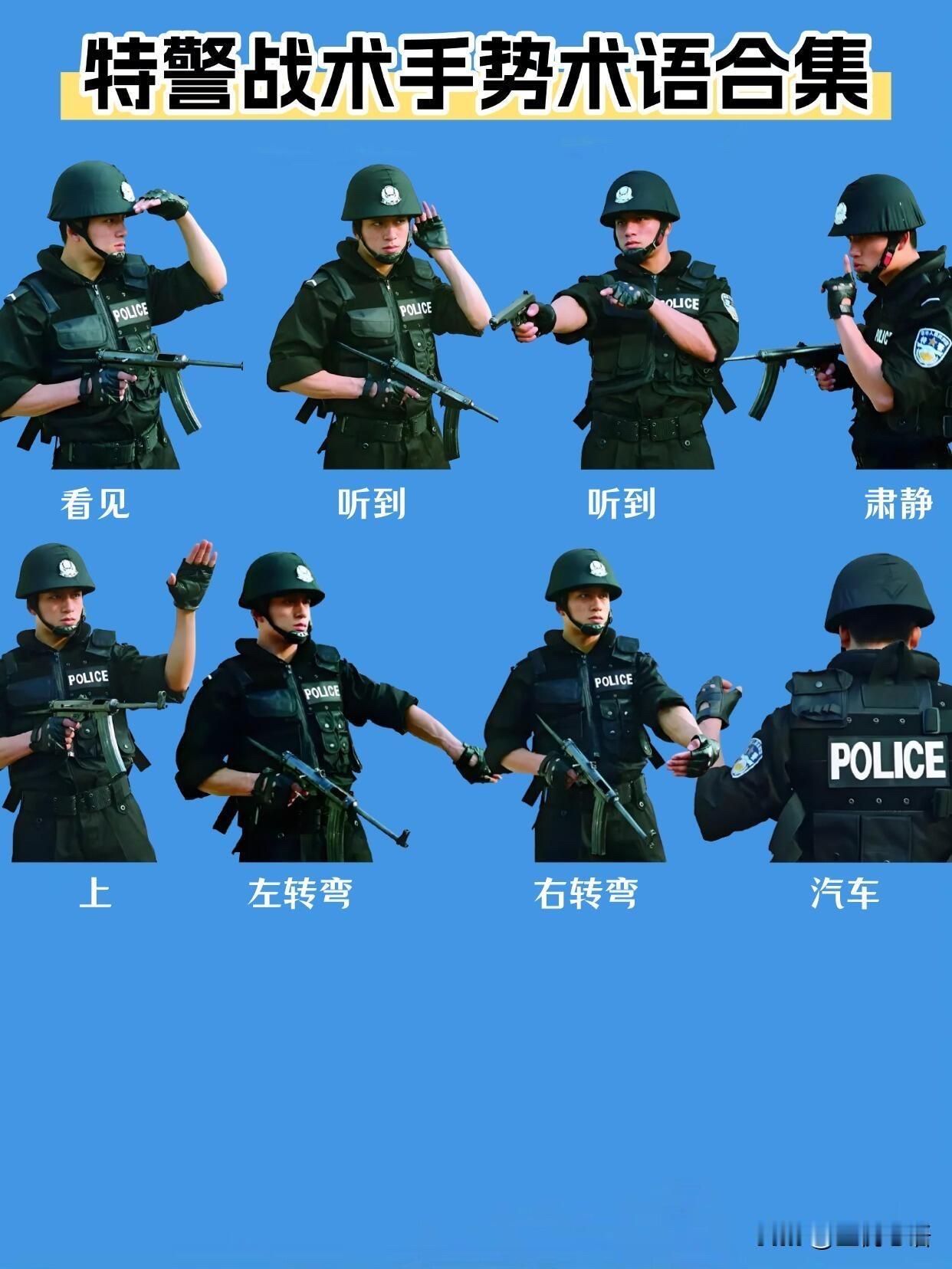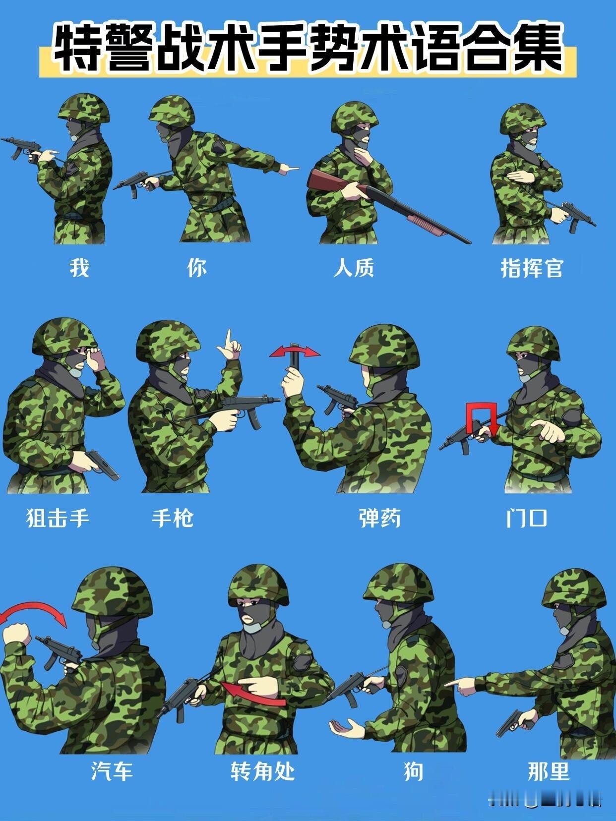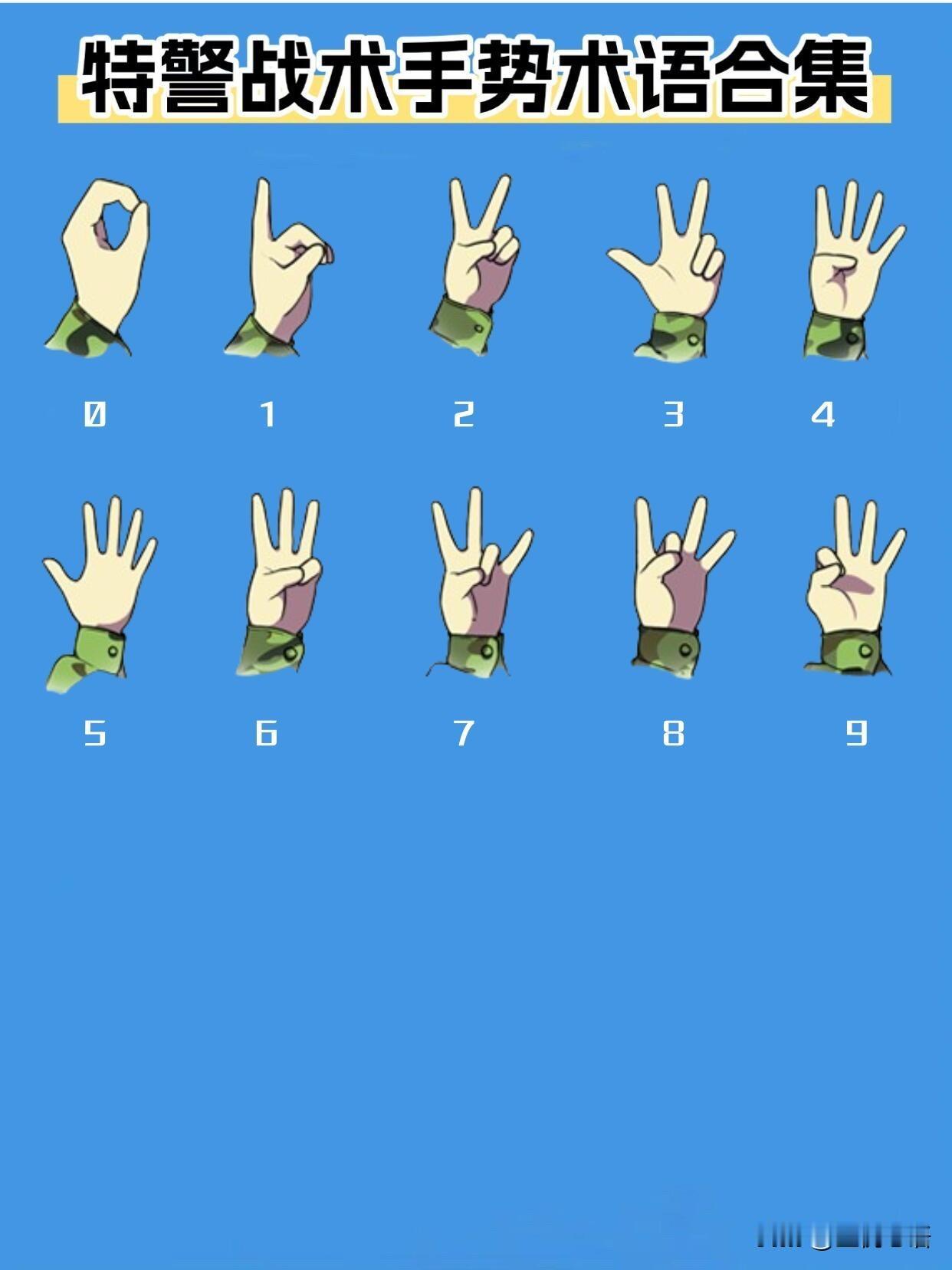 特警战术手势太酷了! 看警匪片总被这无声沟通惊艳。 执行任务时无需言语, 一个手势就能精准传信。 这份战术手势合集超全! 涵盖人员、武器、指令各类信号。 发现敌人、掩护我、向前推进,清晰明了。 成人、小孩、人质,简单手势就能区分。 明白、肃静、集合,队友间秒懂配合。 零基础也能轻松学,一秒上手。 每一个手势都是实战里的默契, 是特警执行任务的关键保障。 涨知识的干货,赶紧收藏!