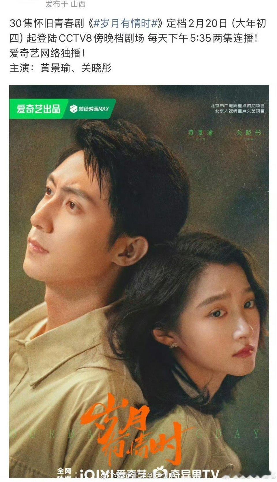 黄景瑜,关晓彤,徐若晗,王天辰新剧《岁月有情时》(原名烟花少年)定档2月20日央八下午档,同样是年代剧,《纯真年代的爱情》就是央八黄金档《岁月有情时》主演阵容还更强吧,粉丝麻辣制片方无能,还不如纯网播呢,上星下午档真的丢不起这个人
