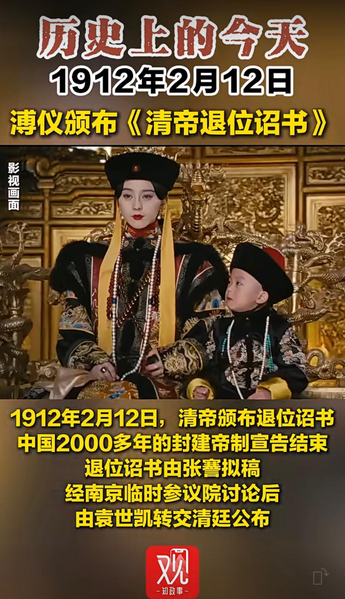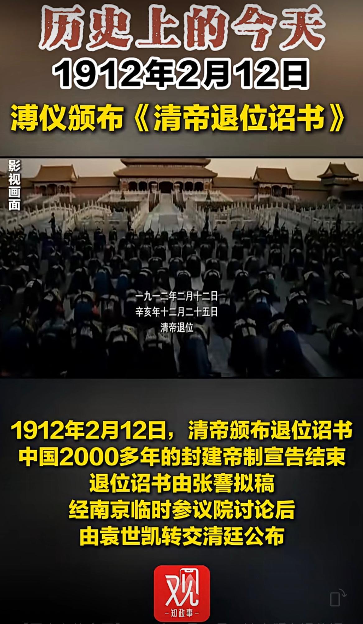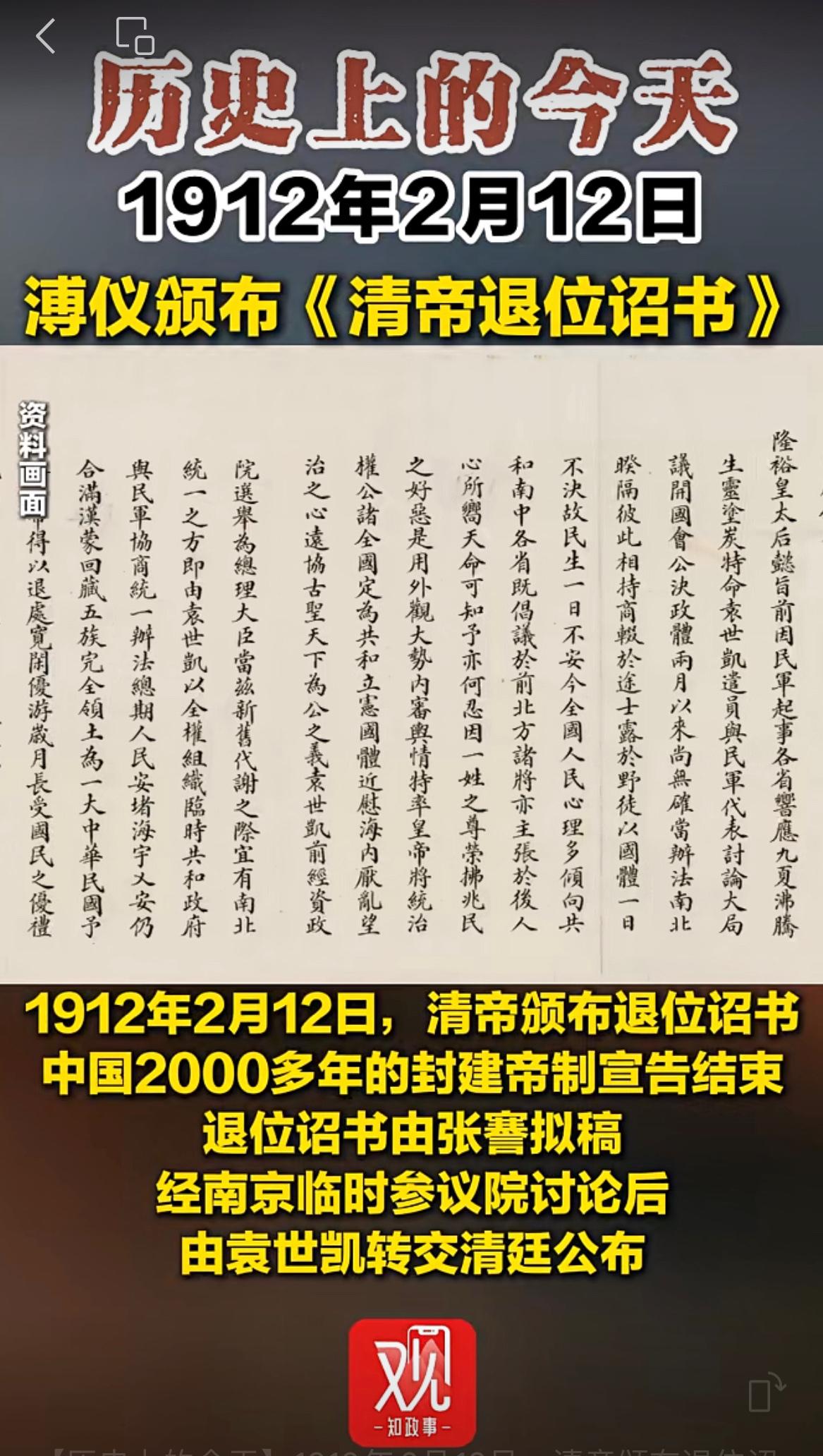 历史上的今天:1912年2月12日,清朝末代皇帝溥仪颁布退位诏书,中国2000多年的封建帝制宣告结束。退位诏书由张謇拟稿,经南京临时参议院讨论后,由袁世凯转交清廷公布。 清朝 末代皇帝 溥仪 帝制