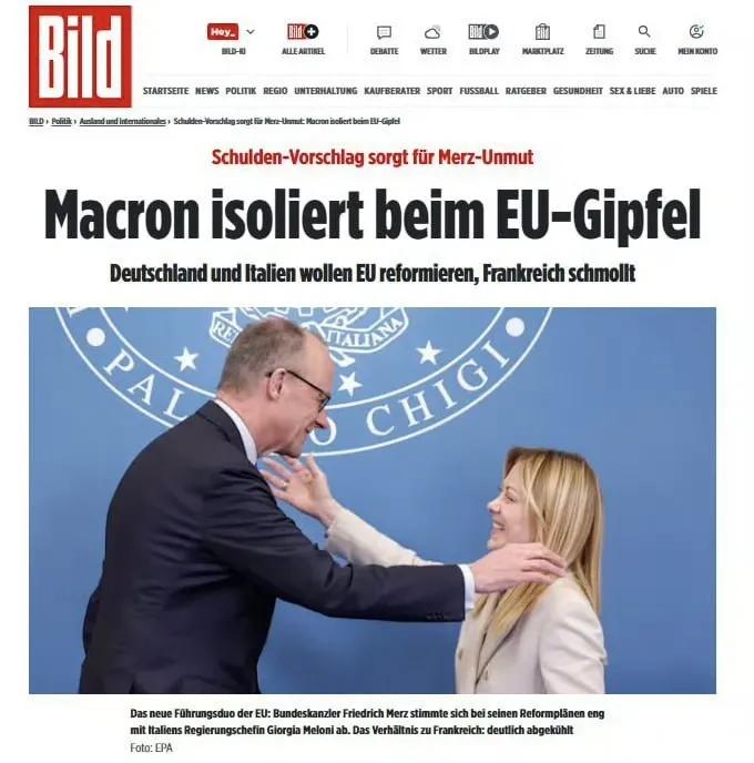 德国《图片报》报道称,法国总统马克龙陷入孤立状态,因为德国总理默茨和意大利总理梅洛尼正在接管欧盟事务。 《图片报》太乐观了,法国的实力在欧盟里是独一档,按照美国“实力为尊”的逻辑,欧盟没有哪个国家敢无视法国。默茨和梅洛尼想把马克龙排挤掉,领导欧盟,只能说想的太美。