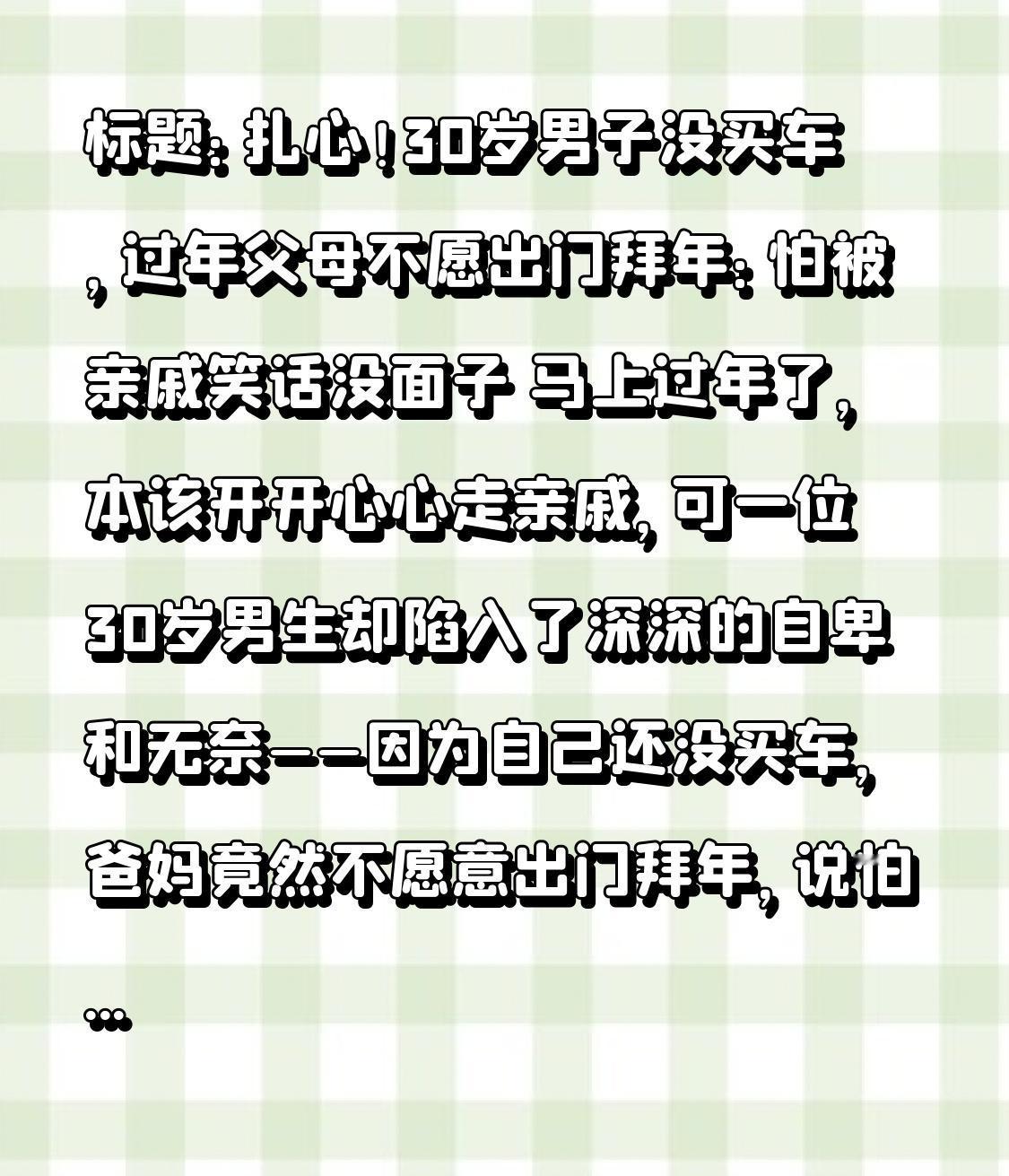 标题:扎心!30岁男子没买车,过年父母不愿出门拜年:怕被亲戚笑话没面子 马上过年了,本该开开心心走亲戚,可一位30岁男生却陷入了深深的自卑和无奈——因为自己还没买车,爸妈竟然不愿意出门拜年,说怕被村里人笑话、怕抬不起头,一句话,让他整夜睡不着。 男生说,自己今年30岁,工作稳定、人也踏实,就是暂时没攒够钱买车。可一到过年,亲戚邻居见面就问:“车买了吗?开啥车回来的?”仿佛没车,就是没出息、没本事、让父母丢脸。 他也想给家里长脸,也想风风光光回家,可现实压力摆在眼前:房贷、生活、开销,每一样都压得人喘不过气。他以为,家人会理解、会心疼,可没想到,最让他破防的话,来自最亲的父母:没车就不去拜年了,丢人。 事情的转折,也戳中了无数普通人的痛处。 这件事一发到网上,瞬间炸锅,几万条评论全是共鸣。 有人说:我也没车,爸妈每次拜年都躲着走; 有人说:过年不是比房比车,是比团圆,可大人偏偏活在面子里; 还有人说:我拼命努力,却依然满足不了父母眼里“有出息”的样子,真的好累。 大家愤怒的不是父母要面子,而是过年本该最温暖的港湾,却变成了比排场、比物质的战场。车是代步工具,不是面子工具;孝顺是真心陪伴,不是豪车撑场。多少孩子在外吃苦受累,回家却要被最亲的人用“有没有车”来评判价值。 30岁没车不可耻,啃老、躺平才可耻;暂时没成功不可悲,不努力才可悲。 不是每个人都能年少有为,大多数人都是普普通通、一步一个脚印在生活。 过年,过的是团圆,不是攀比; 家人,要的是平安,不是排场。 别让一辆车,伤了孩子的心; 别让所谓的面子,淡了一家人的感情。 愿天下父母多一份理解,愿所有努力的年轻人,都能被温柔以待,不被车房绑架,不被面子为难,安安心心、堂堂正正回家过年!
