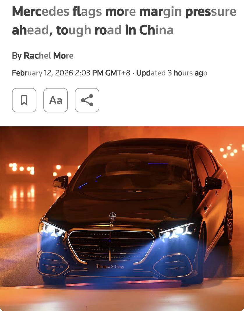 外媒:2026年2月12日,奔驰表示其汽车部门利润空间可能进一步下降。2025年,奔驰营业利润因关税成本、中国市场销量下滑及货币负面影响而减半至58亿欧元,低于预期的66亿欧元。 2026年,奔驰预计核心汽车部门调整后的销售回报率在3%至5%之间,与2025年的5%相比,未达分析师预期的5.4%。 公司股价在结果公布后下跌3.1%。奔驰计划通过大规模产品发布和成本削减来恢复利润,但中国市场竞争激烈,预计2026年销量将继续下滑。