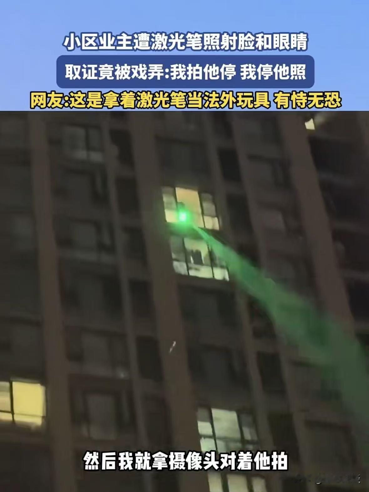 “天生坏种!”江西南昌,女子在小区楼下,突然发现从楼上射下来一束绿光,一直在自己身边摇晃,女子抬头发现有人拿激光笔照射,女子觉得该行为太危险,就拿出手机想要拍下来留证据想要报警,毕竟那光照到眼睛会造成不可逆的伤害,对方见女子拿手机立即把光关掉,等女子把手机收起来后,那人又拿激光笔照射她的脸和眼睛,女子觉得这个行为非常恶劣,网友:必须严惩! 张女士饭后在小区楼下走路,啥也没干、谁也没惹。 突然就感觉一道刺眼的绿光从楼上射下来,在她身边来回晃悠。 一开始她还没反应过来,等抬头一看,楼上居然有人拿着激光笔,专门对着她照。 谁不知道激光笔这东西可不是闹着玩的,尤其是大功率的,直射眼睛那是不可逆的伤害。 轻则视力模糊、眼睛刺痛,重则视网膜灼伤、永久性失明,这是拿别人的生命当儿戏。 张女士当场就觉得这行为太危险了,完全是恶意伤人。 于是赶紧掏出手机,想把这一幕拍下来留证据,然后报警处理,毕竟这种人不惩治,以后还得祸害别人。 对方一看张女士举手机拍摄,立马秒关激光笔,装得跟没事人一样,躲在楼上不敢露头。 张女士看对方把激光笔关了,还以为这个人知道错了、知道害怕了,想着先把手机收起来。 看看对方还会不会再犯,也就没一直举着手机,可万万没想到,人怎么能坏到这种地步! 张女士的手机刚收起来、刚揣进兜里,那道让人恐惧、让人恶心的绿色激光,再一次从楼上射了下来! 这次更过分,直接对准张女士的脸和眼睛猛照,故意挑衅。 张女士当时又怕又气,自己好好走在路上,平白无故遭这种恶意伤害。 这种躲在暗处的恶,比明面上的冲突更可怕,因为你不知道对方是谁、住哪层。 张女士见状没有跟对方硬耗,而是第一时间赶到小区物 业。 把自己遭遇的情况一五一十告诉了工作人员,要求他们严肃处理这件事,一定要找到这个恶意使用激光笔伤人的人。 后来这事发到网上后,网友们全都炸了,评论区一边倒的愤怒:这也太缺德了,纯纯坏种! 躲在楼上搞偷袭,故意照眼睛,必须严惩不贷。 激光笔伤人是违法的,赶紧报警查出来,让他付出代价。 不管是大人还是小孩,这种行为都不能惯,监护人也得担责。 可能有人觉得,不就是个激光笔吗,至于这么上纲上线? 其实激光笔的危害比你想象的大得多,它的光束能量高度集中。 直射眼睛时,会瞬间灼伤视网膜黄斑区,这种损伤是永久性、不可修复的,一旦伤到,视力直接报废,一辈子都好不了。 之前就有很多案例,孩子玩激光笔照伤眼睛,落下终身残疾,大人故意照人,性质更恶劣,这就是故意伤害。 《治安管理处罚法》第51条:殴打他人或故意伤害他人身体,处5–10日拘留,并处500–1000元罚款;情节较轻的,处5日以下拘留或1000元以下罚款。 如果这次恶意照射,对张女士的眼睛造成了实质性损伤,达到轻伤及以上标准,那就不再是简单的治安处罚了。 《刑法》第234条:故意伤害他人身体,处3年以下有期徒刑、拘役或管制。 致人重伤的,处3–10年有期徒刑。致人死亡或特别残忍手段致人重伤残疾的,处10年以上、无期或死刑。 哪怕最后查出来,做这件事的是未成年人,也别想一句不懂事就轻飘飘翻篇。 未成年人违法犯罪,监护人必须承担全部的民事赔偿责任。 该赔医药费赔医药费,该赔精神损失费赔精神损失费,该接受管教就接受管教,绝不能纵容。 这个拿激光恶意照人的家伙,躲得了一时,躲不了一世。 小区有监控、有住户,只要警方介入调查,肯定能揪出这个人。 希望张女士一定要坚持维权,报警到底,也希望相关部门重视起来,尽快找到这个恶意伤人的人,依法处理。 这种天生坏种、恶意伤人的行为,必须零容忍,必须严惩到底! 大家觉得这种人该不该重罚? @静心法谈 学法辨是非,慬法不吃亏。