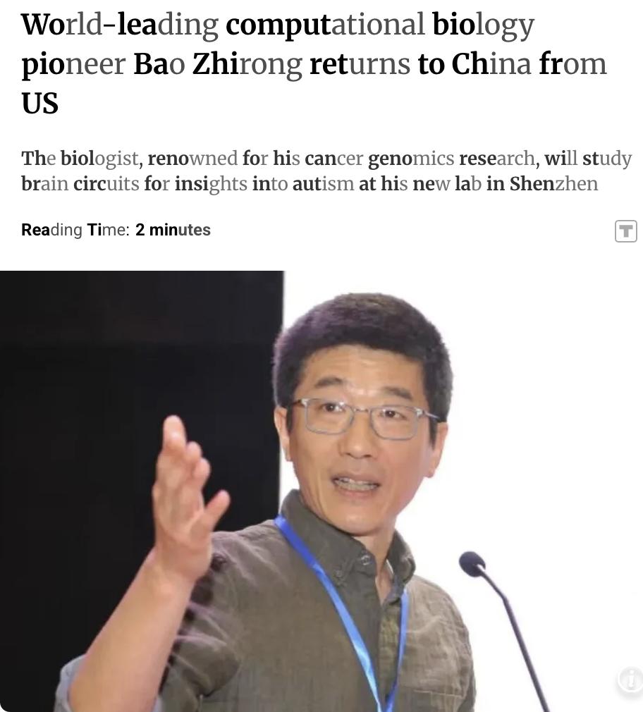 外媒:世界领先的计算生物学先锋鲍志戎在离开美国后全职加入深圳南方科技大学生命科学