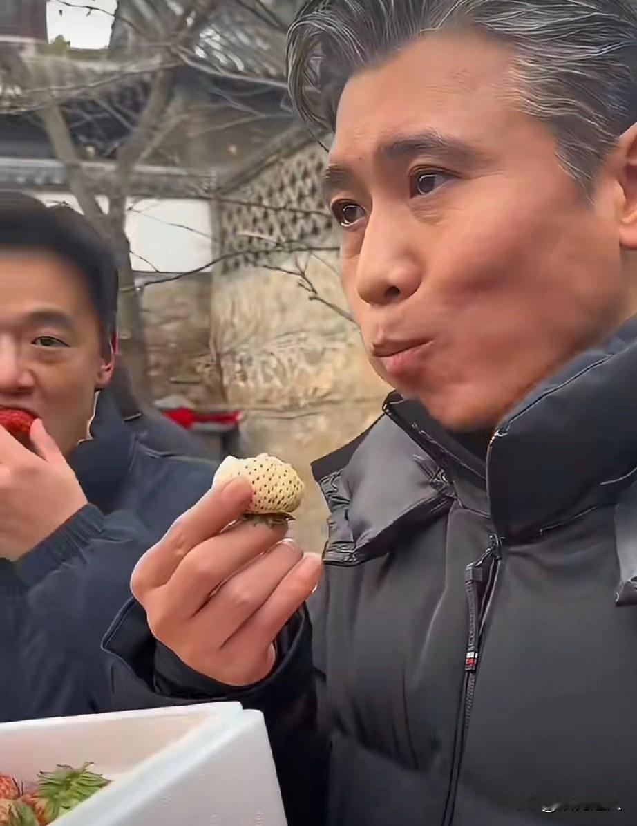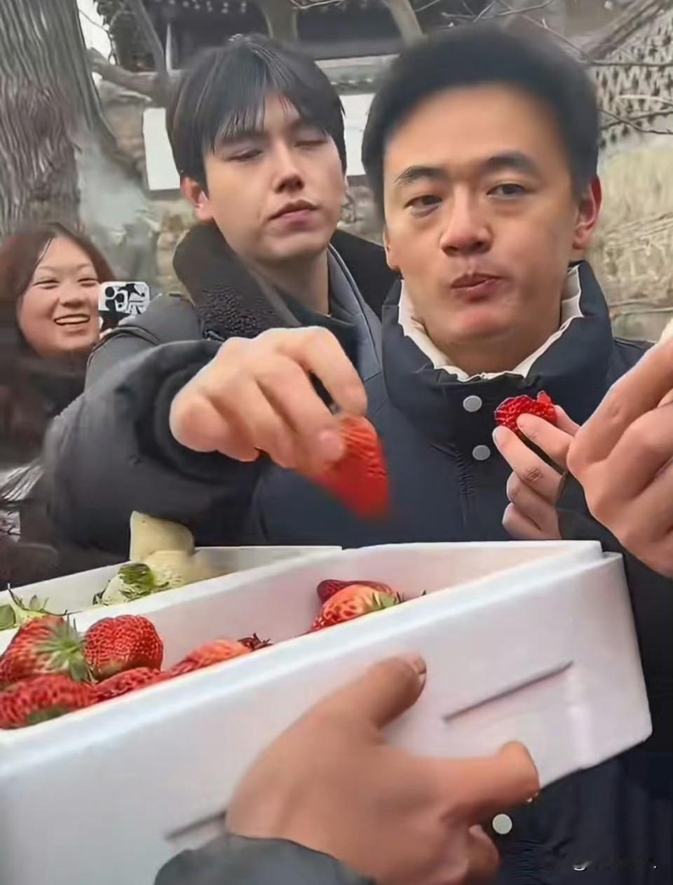 最近刷到不少路人拍的视频,李乃文和陈飞宇在丹东大孤山路边吃草莓,那场面太接地气了,一点明星架子都没有,看着就舒服。 大孤山这边本来就有名,山好景好,还是祈福的好地方,不少人都爱来逛。冬天正好是东港99草莓正甜的时候,个头大、果肉实、汁水足,酸甜口特别正,本地人都爱吃,外地游客来了更是必尝。 俩人估计是录节目或者逛累了,在路边小摊就开炫,李乃文热情招呼,陈飞宇笑着跟着吃,还主动把草莓分给周围路人,帮人捡东西、耐心签名,跟街坊邻居唠嗑似的,特别自然。 其实这事看着小,却挺有道理。明星也是普通人,卸下镜头里的包装,逛景点、吃路边水果、跟大家热热闹闹互动,这种真实的烟火气,比刻意摆拍好看多了。不端着、不做作,踏踏实实享受一口甜、一份热闹,反而更招人喜欢。 也多亏这俩明星,让更多人知道大孤山的好、东港草莓的甜。本地有好山好水好特产,再加上这么真实的偶遇,不用硬宣传,大家就愿意来玩、来尝鲜,对当地旅游和农户都是好事。