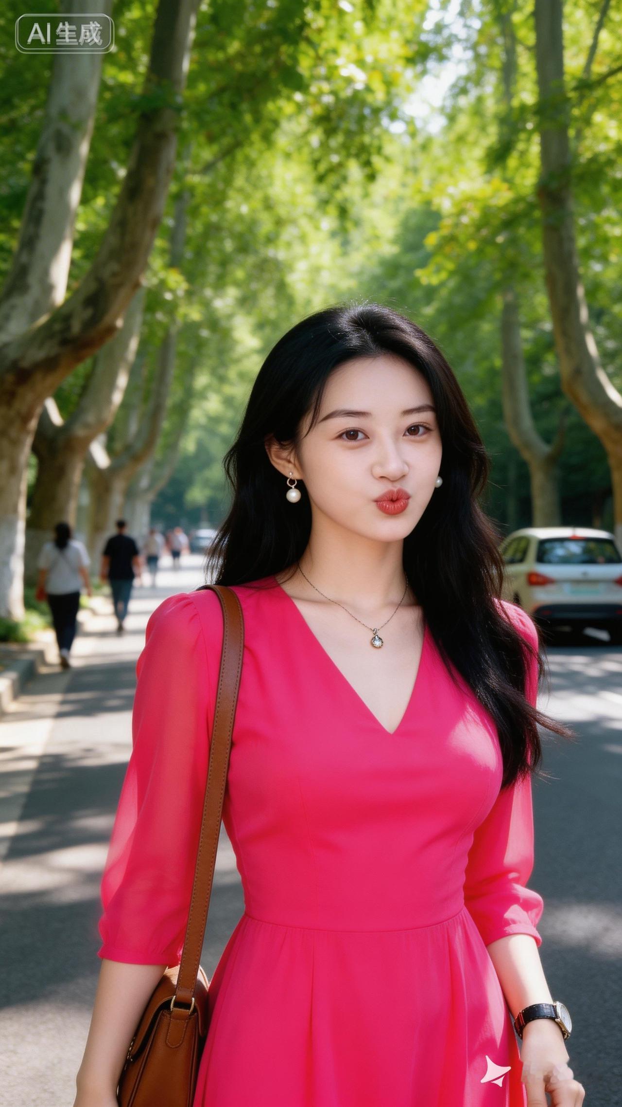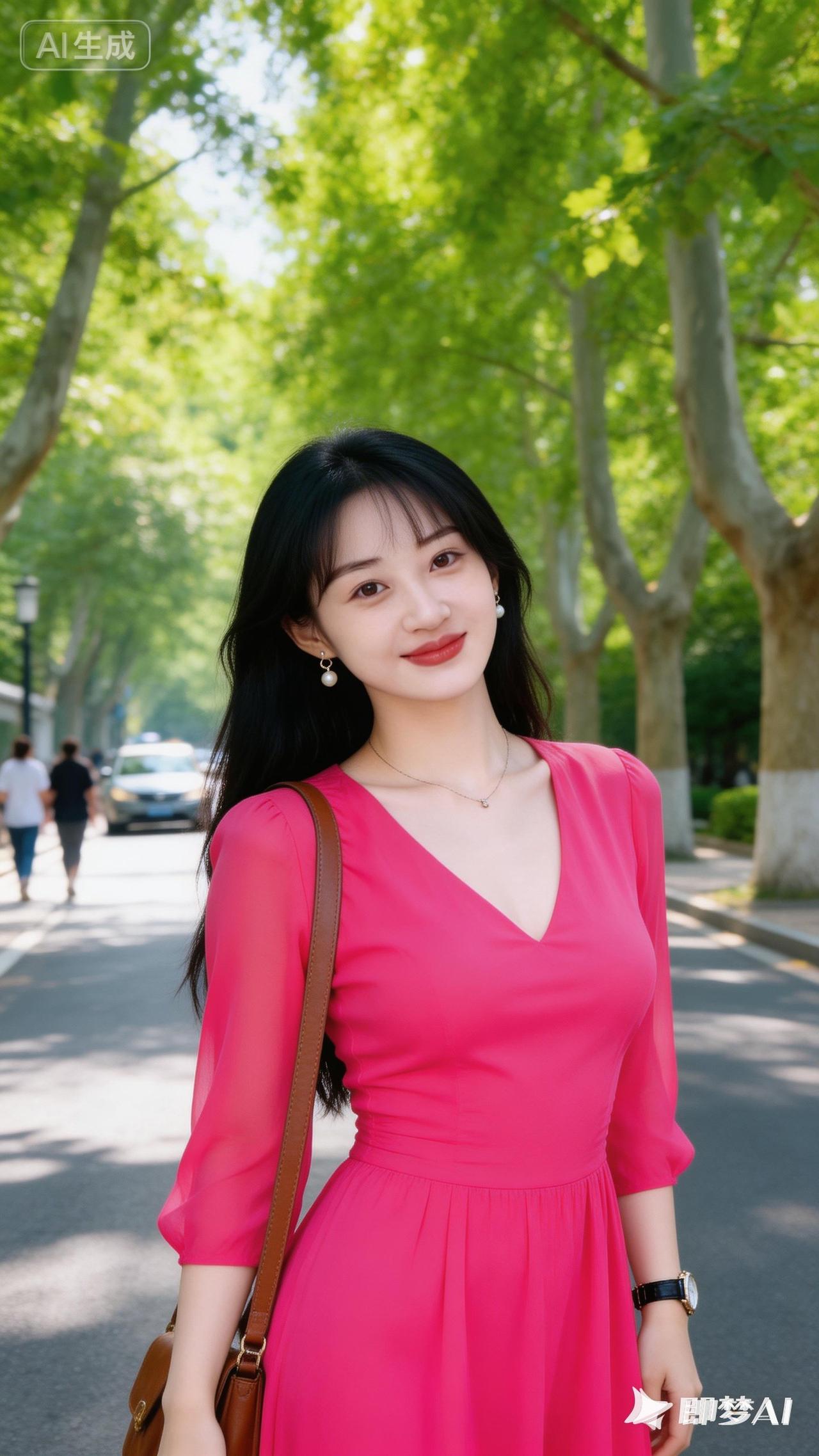 秋日暖阳下,红裙少女倚墙而立,笑靥如花。