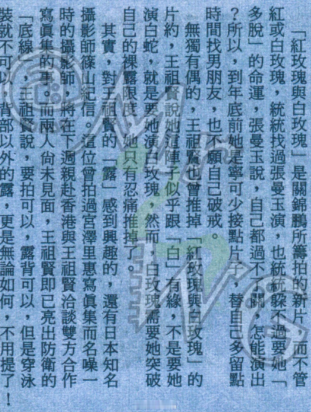 王祖贤也表示,她那阵子和白色很有缘,不是让她演白蛇,就是演白玫瑰,但不可以突破她的袒露界限,所以忍痛割爱,同样放弃。