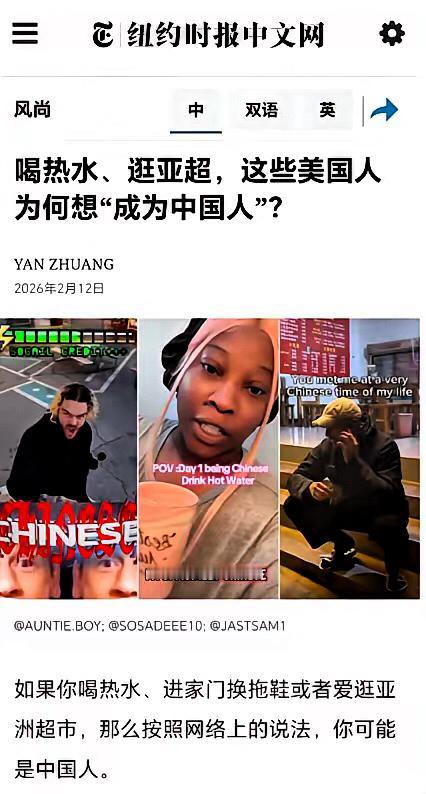 纽约时报都认证了! 大批美国人想当“中国人”? 别误会,这不是要换国籍,是迷上 了中式生活方式。 喝热水、穿拖鞋、逛大超市, 美国女孩自称“中式坏女孩”, 自信又迷人, 这股风潮,藏着中国文化的吸引力。 中式审美崇尚自然, 养生方式温暖治愈, 比起紧绷的美式节奏, 中式松弛感更让人向往。 文化的传播从来不是硬输出, 是用生活里的小细节, 让人自愿靠近。 你身边有没有被中式生活圈粉的外国人? 评论区唠唠!