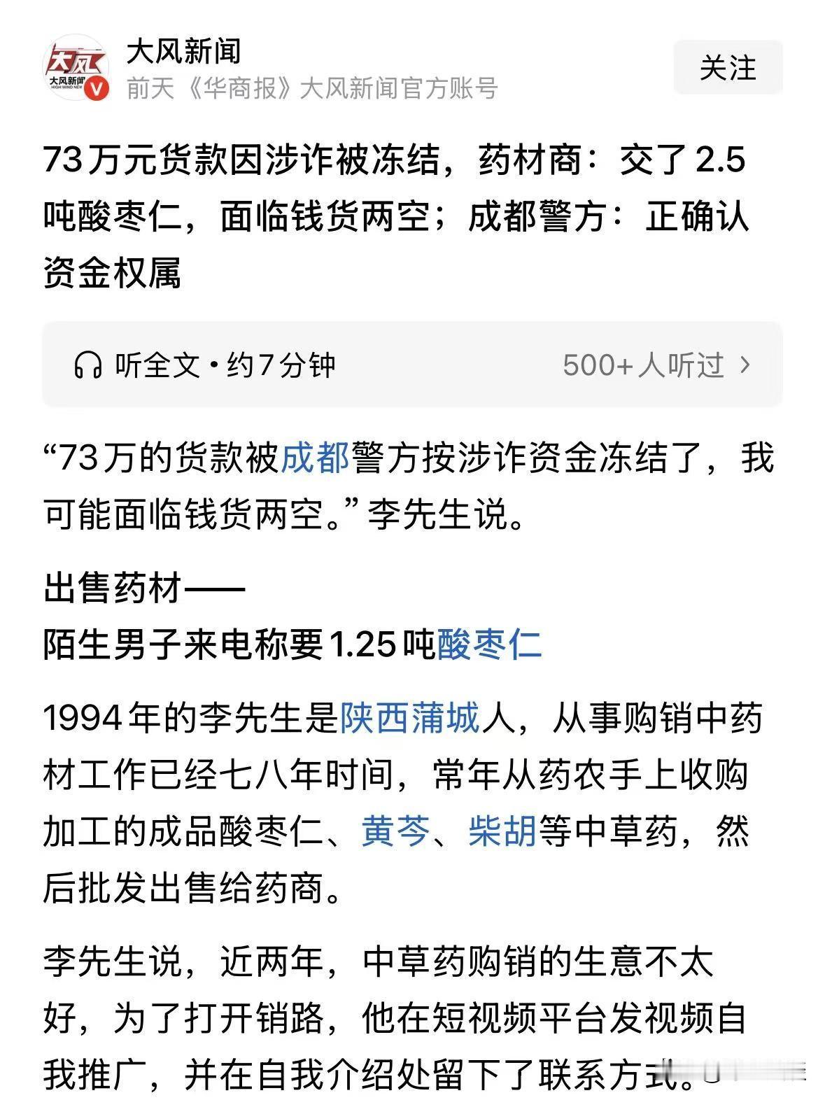 陕西渭南,一药材商接到2.5吨酸枣仁的大单,凑齐货物后收到73万货款。次日去收取药材的时候,他的账户竟被外地警方冻结,这笔货款被认定为涉 诈资金,但现在货发完了、钱进了账户却动不了,一夜之间陷入钱货两空的地步,男子赶紧找警方解释自己是正常交易,申请解冻,结果警方的答复让他十分无奈。 李先生常年做酸枣仁,中药材生意,那天突然接了一笔大订单,以为翻身的机会来了。 结果一夜之间掉进深渊,货发没了、钱冻住了、人快愁疯了。 那个大客户个,一开口就要2.5吨酸枣仁,李先生开心坏了,这种超大的单子可不是年年有。 可是他他自己库里只有1.25吨,为了接住这笔生意,他赶紧托朋友、找渠道,又凑了1.31吨,把2.5吨货全部备齐、按时交付。 大客户也很痛快,直接把73万元货款转到了李先生的账户里。 钱到账、货送走,一笔完美的交易完成,李老板心里别提有多高兴。 第二天李老板准备再去收购新药材,继续周转生意。 但收购药材需要用钱,李老板准备花这笔货款的时候,整个人当场傻掉。 显示账户被冻结,他赶紧打电话询问,那边一查,告诉李老板收到的73万,是涉 诈资金。 那一刻,他脑子一片空白,货已经全部被拉走了,钱刚进账户,一分没花,直接被冻结,取不出来。 这里面有他自己的库存本钱,还有从朋友那调货的钱。 一旦没了,不光这笔生意亏到姥姥家,整个生意都要垮掉,甚至可能负债累累。 他慌了,但也清醒,自己全程正常交易、没有诈骗、没有坑人,就是卖了货、收了钱,凭什么被冻结? 他第一时间主动联系冻结的警方解释:自己是正经药材商。 客户下单、我供货、货到付款、价格公道、有单有据、有货有物流,完全是合法合规的正常生意,我根本不知道对方的钱是怎么来的。 他把交易记录、聊天记录、发货凭证、物流信息全都整理好。 一遍又一遍跟警方解释,只求能尽快核实、解冻货款,让他能活下去。 他还找来给自己送货的两个司机,及自己调货的朋友,想要他们证明自己确实是发了货,没骗人。 但警方只是告诉他,这起案件涉 案金额接近80万元,数额巨大。 至于资金到底属于受骗者还是合法货款,还没有查清,必须慎重处理,在调查清楚之前,不能随意解冻资金。 他一个普通生意人,哪有能力去辨别客户口袋里的钱,是干净的还是赃款? 《民典法》第311条:无处分权人将不动产或者动产转让给受让人的,所有权人有权追回;除法律另有规定外,符合下列情形的,受让人取得该不动产或者动产的所有权: (一)受让人受让该不动产或者动产时是善意。 (二)以合理的价格转让。 (三)转让的不动产或者动产依照法律规定应当登记的已经登记,不需要登记的已经交付。 第一,李老板不知对方资金是诈骗款,无参与、无过失。 第二,酸枣仁交易符合市场价,73万对应2.5吨属正常,且2.5吨货已全部拉走,交易完成。 所以目前来看,李老板属于善意取得,或许73万货款可以不被追缴。 这件事在网上传开后,很多做生意的网友都感同身受,又怕又气。 有人觉得这也太冤了,正常做生意还要自带验钞机,查资金来源吗? 这老板也太惨了,货没了钱冻了,这谁受得了。 说实话,打击诈 骗、冻结赃 款,大家都支持,这是保护老百姓的钱袋子。 但不能让一个完全无辜、正常经营的商户,为这种行为买单。 他没有过错,没有过失,尽到了所有交易义务,就应该被保护,而不是被误伤。 现在这位药材老板还在四处奔波、反复沟通,只想要回自己的血汗钱。 这事也提醒所有做生意的朋友,这年头收款真的太危险了,大单来了别光高兴,一定要多留个心眼。 大家觉得,这位老板冤不冤?这笔钱该不该解冻! @静心法谈 学法辨是非,慬法不吃亏。