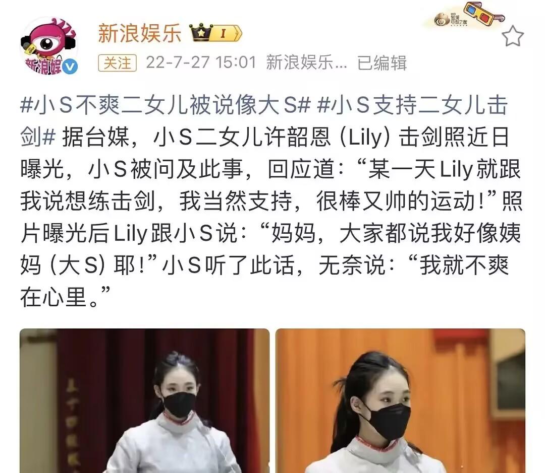 小S的二女儿曾在22年的时候被说像大S,但小S在接受采访时却表示,自己对于这个说法很不爽。 因为她觉得大家总是把美的好的都说成是像大S,而许老三的搞怪这些就说是像她,她觉得很不服气。 如今大S不在了,小S倒是愿意让大家说女儿像大S了。