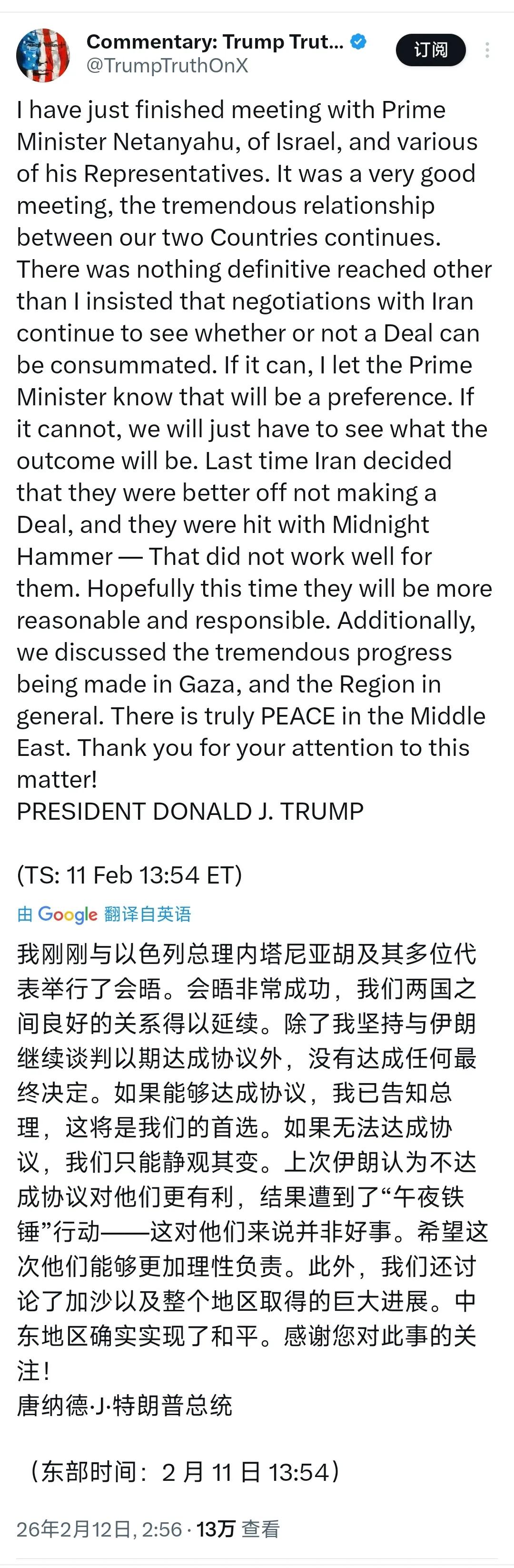 与以色列总理内塔尼亚胡结束会谈后,特朗普今天(北京时间2月12日)发文写道:“我刚刚与以色列总理内塔尼亚胡及其多位代表举行了会晤。会晤非常成功,我们两国之间良好的关系得以延续。除了我坚持与伊朗继续谈判以期达成协议外,没有达成任何最终决定。如果能够达成协议,我已告知总理,这将是我们的首选。如果无法达成协议,我们只能静观其变。上次伊朗认为不达成协议对他们更有利,结果遭到了‘午夜铁锤’行动这对他们来说并非好事。希望这次他们能够更加理性负责。此外,我们还讨论了加沙以及整个地区取得的巨大进展。中东地区确实实现了和平。”