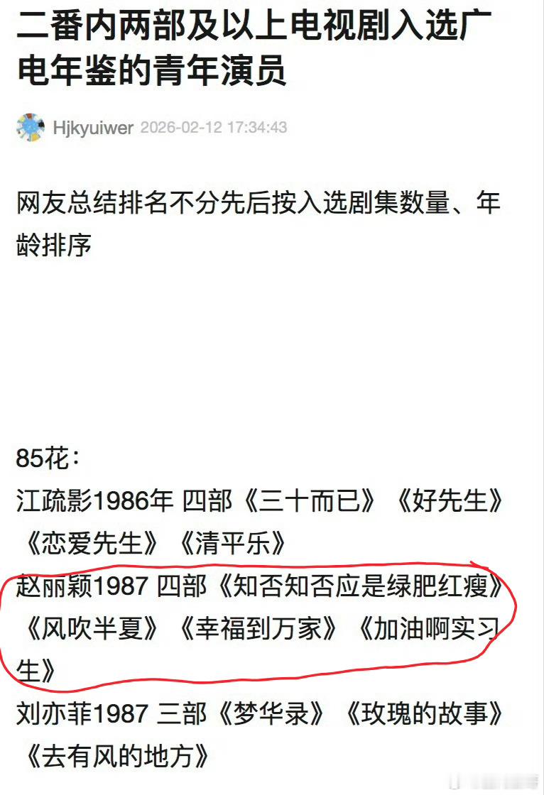 两部及以上二番内剧集入围广电年鉴的青年演员赵丽颖凭借知否、加油啊实习生、幸福到万家、风吹半夏狂揽四部,播放量咱有、收视率咱有、口碑咱有、视后咱有、官方认可咱也有,你无敌了呀赵丽颖!