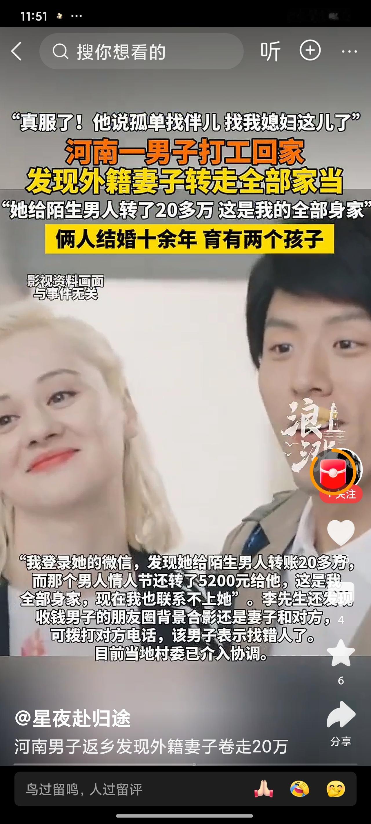 河南男子过年崩溃!外籍妻子失联卷走全部积蓄,20多万转给陌生男,情人节还收5200! 春节本是阖家团圆的好日子,河南济源的李先生却遭遇了晴天霹雳!在外辛苦打工十几年,揣着满心期待回家过年,没等到妻儿团聚,却发现外籍妻子突然失联,自己半辈子攒下的血汗钱,竟被她全部卷走! 李先生和妻子结婚十余年,两人育有两个孩子,日子虽不富裕,却也算安稳。可今年春节他返乡后,妻子毫无征兆地消失,电话不接、信息不回,彻底断了联系。 心急如焚的李先生登录妻子微信,直接被眼前的真相扎心了:妻子竟陆续给一名陌生男子转账20多万元,这可是他全部的身家! 更离谱的是,这名陌生男子情人节还特意给妻子转了5200元示爱,朋友圈背景赫然是两人的亲密合影! 李先生拨通对方电话讨要说法,对方却装傻充愣,直接声称“找错人了”,态度嚣张至极! 这事一出,网友们直接炸锅了: “十几年夫妻,还有两个孩子,怎么能狠心卷走全部辛苦钱?” “打工攒钱不容易,这一下全没了,换谁都得崩溃!” “外籍婚姻真的要多留个心眼,财产安全太重要了!” “情人节转5200、合照都摆出来了,明显是早有预谋啊!” 说实话,看完真的替李先生感到心寒!在外风吹日晒打拼,攒的每一分钱都是血汗钱,本想给家人撑起一个家,却被最亲近的人狠狠背刺。 十几年的夫妻情分、骨肉亲情,在这一刻显得无比廉价,这种毫无征兆的背叛,比没钱更让人绝望。 目前当地村委已经介入协调,希望能帮李先生追回损失,也给所有在外打拼的人提个醒:婚姻里再信任对方,也要守住自己的财产底线,别让辛苦半辈子的付出,沦为一场空! 大家觉得这事该怎么维权?评论区聊聊~