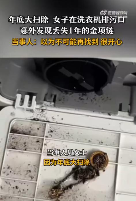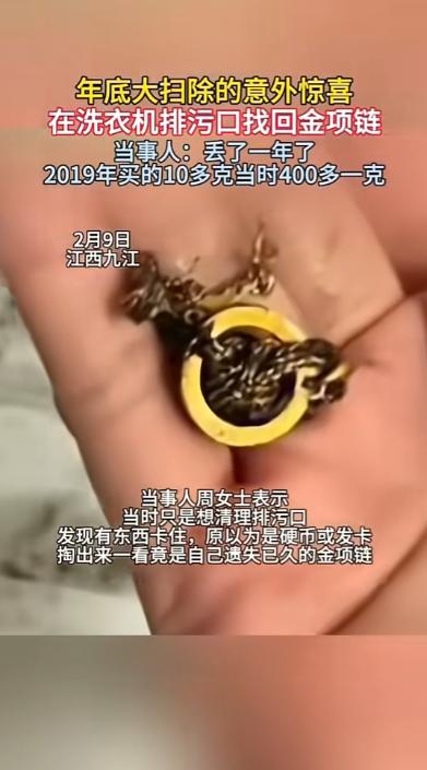 “简直赚翻了!”近日,江西九江,一女子在大扫除中,清理洗衣机排污口时摸到一个硬硬的东西,掏出来一看,竟然是她消失了一年的金项链!这条项链有10克多重,买的时候金价每克才400余元,现在价格已经翻倍!网友:我也要大扫除一下! 近日,江西九江一女子趁着有空,就打算把家里彻底打扫一遍,连平时不怎么注意的角落也没放过。 打扫到阳台的洗衣机时,周女士想着这机器用了挺久,底部的排污口肯定攒了不少污垢和杂物,就打算好好清理一下。 平时大家清理洗衣机,大多只擦表面和滚筒,排污口很少有人特意去掏,里面又黑又窄,一般都是积攒着线头、碎屑之类的东西。 周女士先拔掉了洗衣机的电源,然后慢慢拧开排污口的盖子,里面的脏东西跟着水流一起流了出来,她就耐心地一点点清理。 就在她用手去掏排污口深处,想把卡住的杂物弄出来时,指尖突然碰到了一个硬硬的东西,摸起来滑溜溜、沉甸甸的,不像是平时的线头或者硬币。 她心里愣了一下,也没多想,就伸手把那个硬硬的东西掏了出来,还顺手用纸巾擦了擦上面的污垢。 等擦干净一看,周女士一下子就愣住了,那竟然是一条金项链,仔细一看,正是她一年多前丢失的那一条。 这条项链是周女士的丈夫送给她的,平时她都贴身戴着,丢了之后,她找了好久,把家里的卧室、客厅、阳台,甚至床底、垃圾桶都翻了个底朝天,连洗衣机滚筒都拆开找过,可怎么都找不到。 时间久了,她也慢慢放下了,以为这辈子都不可能再见到这条项链了,早就接受了丢失的事实。 后来周女士才想起来,应该是之前洗衣服的时候,忘了把项链从衣服口袋里掏出来,不小心跟着衣服一起放进了洗衣机,运转的时候,项链掉了出来,顺着排水管掉进了排污口,一直卡在里面,藏了整整一年多。 要不是这次大扫除,特意清理排污口,这条项链可能就一直藏在里面,说不定等洗衣机坏了被回收,就再也找不回来了。 周女士找到项链后,又意外又开心,连打扫卫生的疲惫都没了,连忙拿着项链去给丈夫看,丈夫也觉得特别不可思议。 有人说,现在的金价比她买项链的时候涨了不少,相当于意外赚了一笔,所以才有了“简直赚翻了”的说法。 这件事被分享到网上后,很快就引起了网友们的热议,不少网友都留言说,太幸运了,这才是大扫除最大的惊喜,还有很多网友调侃说,自己也要赶紧回家大扫除,说不定也能从家里的犄角旮旯里,找出意外的惊喜。 周女士也提醒大家,平时洗衣服的时候,一定要记得掏干净口袋,贵重物品也要妥善保管,避免不小心丢失。 以上都是个人观点,对此您有什么不同的看法,可以在评论区留言讨论!!!