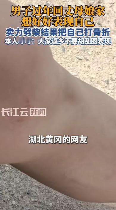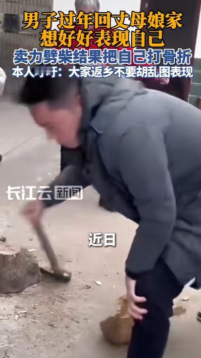 “这下尴尬了吧!”近日,湖北黄冈,一男子回丈母娘家,见院子里堆着柴火,就想表现一下,没想到因为缺乏经验,斧头打滑,木柴直接反弹,导致他直接骨折,疼得他哇哇直叫,只能去医院打石膏,估计需要数月才能恢复!网友:劲真大! 最近湖北黄冈发生了一件让人又好笑又心疼的事,一名男子回丈母娘家,本来想好好表现一番,结果反倒把自己弄进了医院。 这名男子姓龚,事发时他回丈母娘家走亲戚,看到院子里堆着不少柴火,心里就盘算着主动帮忙劈柴,也好在丈母娘面前留个勤快能干的好印象。 可他之前从来没劈过柴,一点经验都没有,压根不知道劈柴还有讲究,也没多想,随手就拿起斧头,撸起袖子就开始忙活起来。 当时院子里是水泥地面,没有松软的土地缓冲,而且那些柴火也没干透,质地偏硬还有韧性。 龚先生没找对劈柴的角度,也没掌握好力度,一斧头下去,不仅没把木柴劈开,斧头还突然打滑,木柴瞬间反弹回来,重重砸在了他的腿上。 突如其来的剧痛让龚先生当场就受不了了,疼得他哇哇直叫,连站都站不起来。 丈母娘家一家人听到动静,赶紧跑出来看,看到他疼得直打滚,立马就慌了神,赶紧把他送到附近的医院检查。 经过医生诊断,龚先生的腿骨折了,随后医生就给他打了石膏固定,让他回家安心休养。 后来龚先生回应这件事时说,现在他的拐杖和纱布已经拆了,但伤势还没完全好,日常只能慢慢走或者开开车,不能做重活,估计还得好几个月才能彻底恢复正常。 他自己也又好气又好笑,直言自己是好心办了坏事,就因为一时想表现,又没经验,才酿成了这样的意外。 这件事传到网上后,很快就引发了网友们的热议,有网友调侃说“劲真大,没劈开柴倒把自己劈骨折了”,还有网友打趣,本来想在丈母娘面前露一手,结果反倒添了乱,堪称“最惨女婿”。 也有不少网友借着这件事提醒大家,没经验的活可别盲目上手,尤其是劈柴这种有风险的事,千万别为了表现硬逞强。 其实说到底,龚先生的心意是好的,想在长辈面前表现勤快,也是一片孝心。 但不管做什么事,安全都得放在第一位,没经验就别轻易尝试,不然不仅帮不上忙,还会让自己受伤,反倒给家人添了麻烦,这样就得不偿失了。 以上都是个人观点,对此您有什么不同的看法,可以在评论区留言讨论!!!