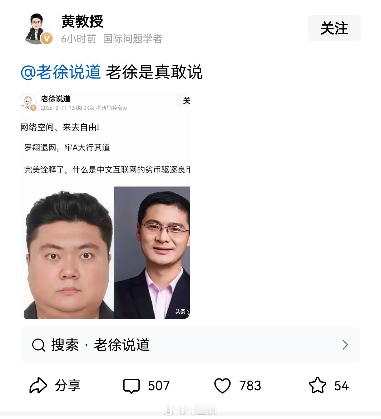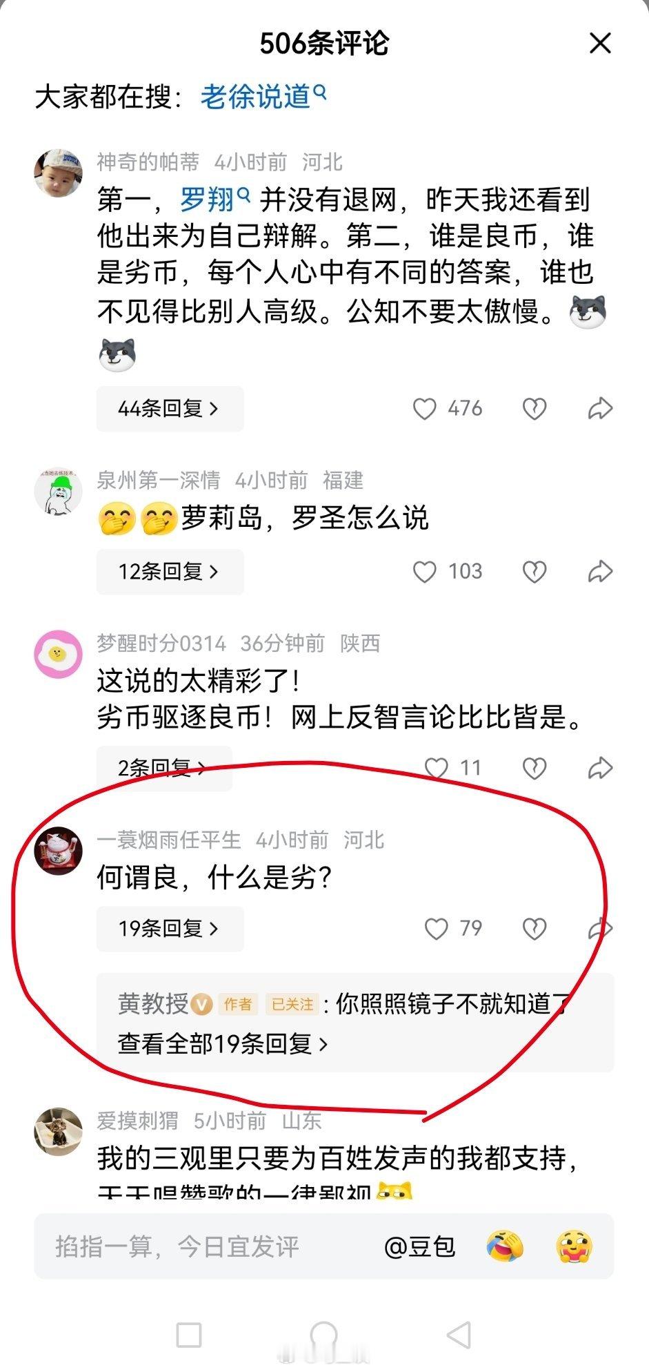 “谁是劣币,谁是良币?你照照镜子就知道了。”该照照镜子应该是老徐和黄教授这批人吧