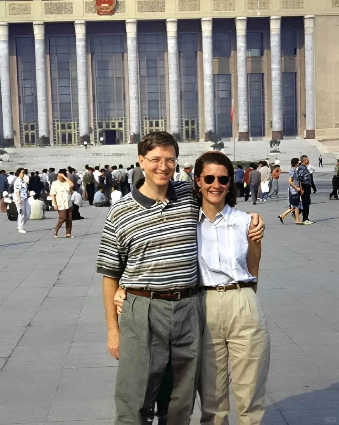 1995年,比尔盖茨以200亿美元身价登上全球首富宝座。他于当年夏天带着妻子梅琳达前往中国旅行,并在北京人民大会堂前留下了这张照片。照片中两人恩爱有加、自然得体。那时的他也满脸阳光,没牵扯各种阴谋论,没和爱泼斯坦扯上关系、没上萝莉岛,更没和俄罗斯未成年少女厮混染上性病。比尔盖茨如果看到这张照片又是什么感受呢?