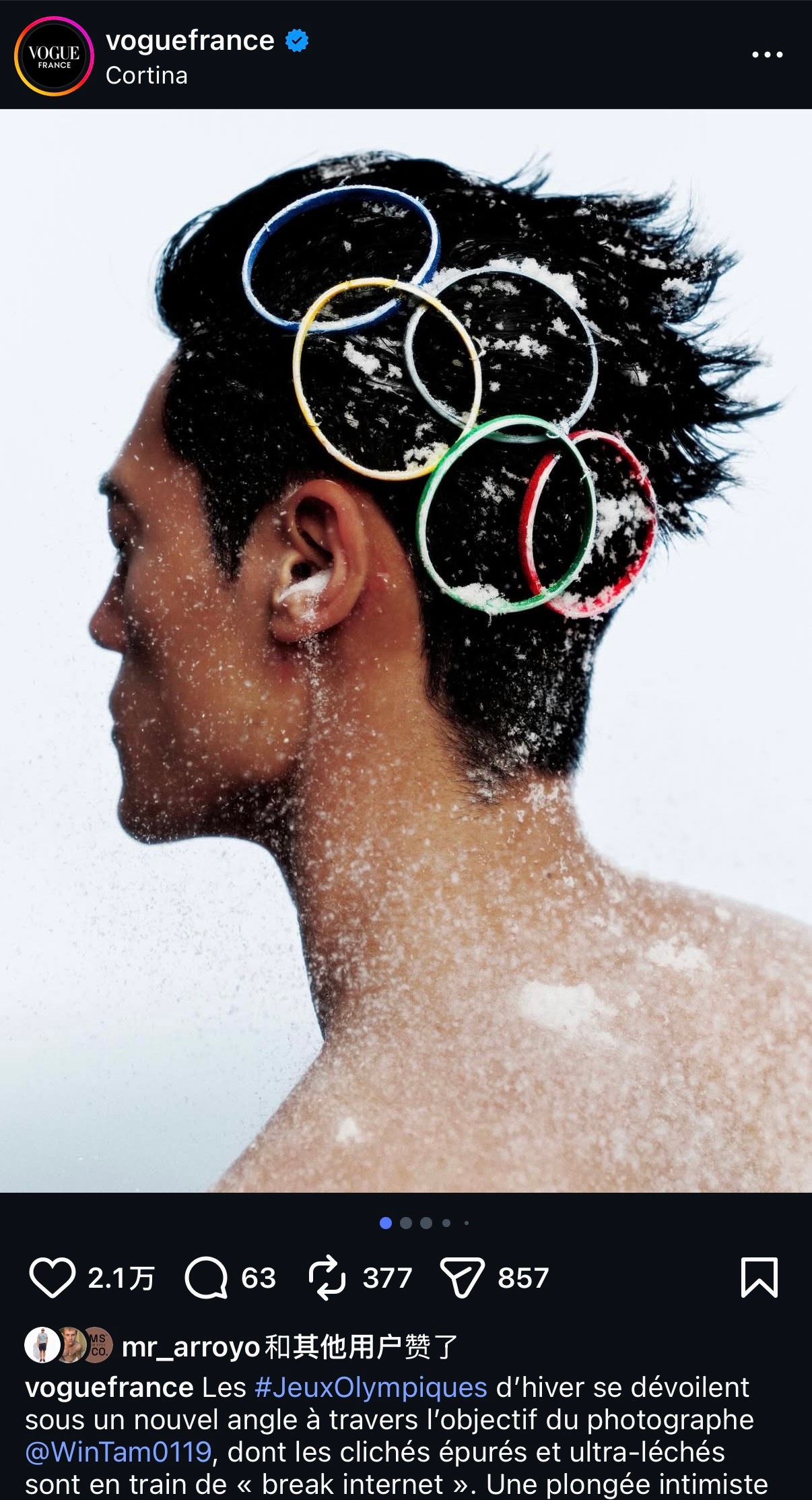 法国版 VOGUE 也有惊喜发布由摄影师 Wintam 为中文版 VOGUE Man 创作的这组冬奥主题大片 ,并且这组创作在海外也爆了哦 !数据非常好 ,当然了 ,贴合主题又极具视觉张力 ,标志性的元素 、设计 ,与项目的呼应乃至力与美的结合 ,水准确实是出色 !值得再次回顾 ~