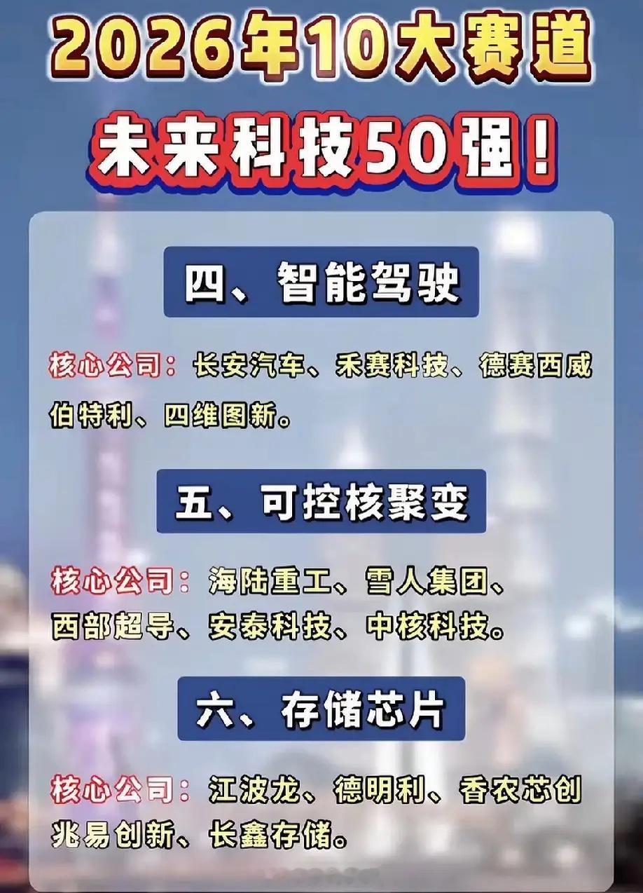 2026年未来科技10大赛道龙头名单曝光!从人形机器人到光刻机,从AI算力到可控核聚变,50家核心公司全梳理,精准锁定科技主线投资机会,收藏这一份就够了!AI算力核心逻辑:大模型迭代与AI应用爆发,算力需求呈指数级增长,GPU、服务器、光模块等基础设施成为核心瓶颈,国产替代空间巨大。行业龙头代表中科曙光。存储芯片核心逻辑:AI服务器与消费电子复苏带动存储需求回暖,国产厂商在DRAM/NAND领域技术突破,行业周期触底回升。行业龙头代表长鑫存储。人形机器人核心逻辑:工业自动化升级+人口老龄化催生劳动力替代需求。行业龙头代表拓普集团、三花智控……⚠️ 风险提示:以上分析仅为行业趋势梳理,不构成任何投资建议。科技行业技术迭代快、政策与市场波动大,投资需谨慎评估风险。