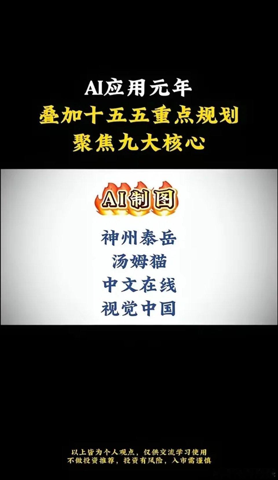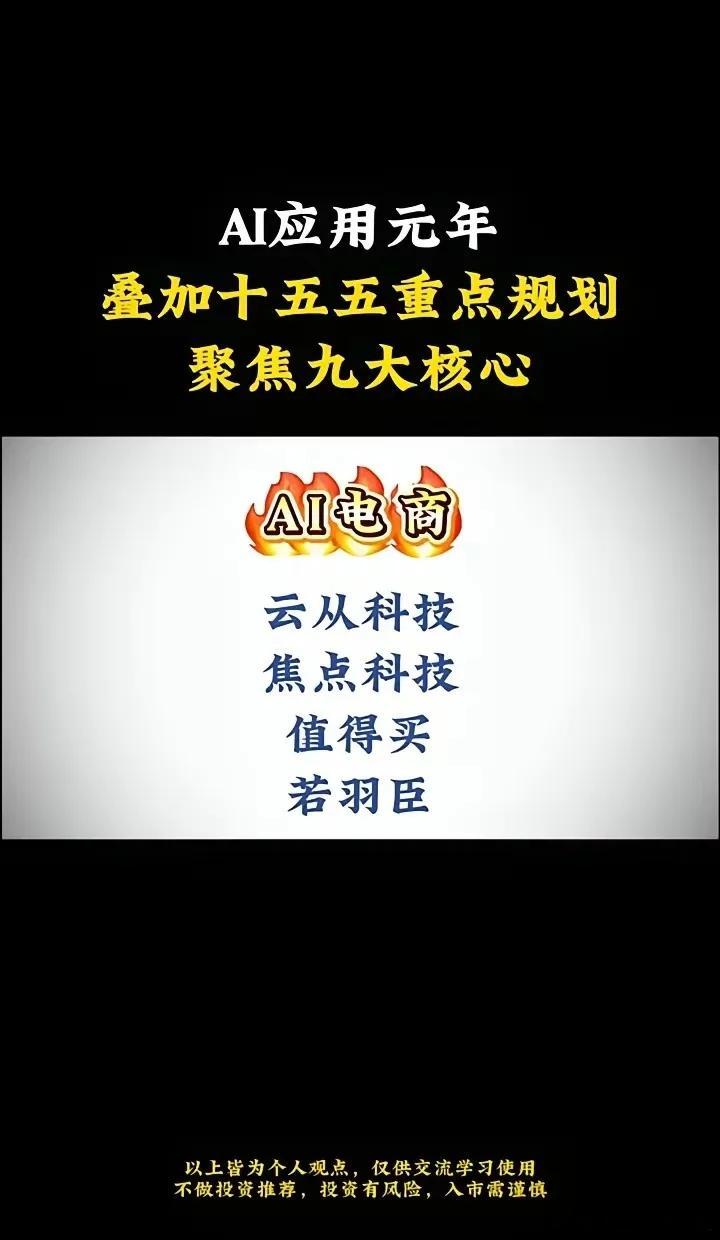 AI应用元年,聚焦AI五大核心!AI应用元年叠加十五五重点规划,聚焦九大核心。·AI漫剧:捷成股份、荣信文化、中文在线、文投控股。·神州泰岳:汤姆猫、视觉中国、世纪华通、巨人网络、昆仑万维、三七互娱。·科大讯飞:中公教育、豆神教育、中原传媒、中科创达、卓易信息、赛意信息。·金山办公:利欧股份、福昕软件、三六零、蓝色光标、易点天下、云从科技、焦点科技。·若羽臣:AI4S、岩山科技、志特新材、苏博特、直真科技。股市超话微博股票超话A股超话