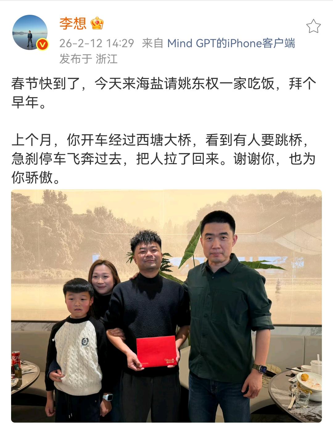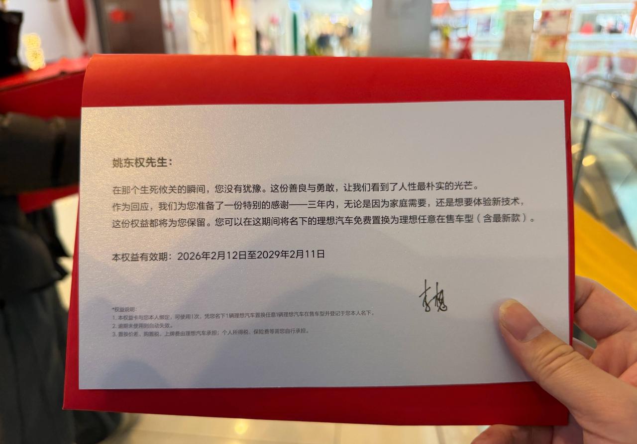 李想:春节快到了,今天来海盐请姚东权一家吃饭,拜个早年。 上个月,你开车经过西塘大桥,看到有人要跳桥,急刹停车飞奔过去,把人拉了回来。谢谢你,也为你骄傲。 李想的出手很大方,大家可以看图2和图3,但是李想本人自己并没有进行过多宣传,在2029年2月11日之前,姚东权都可以凭借着李想本人签发的这个卡片兑换任意一辆理想的新车。 这位车主做的非常好,理想这个品牌做着也非常的好,各位是怎么看的?欢迎评论区留言。