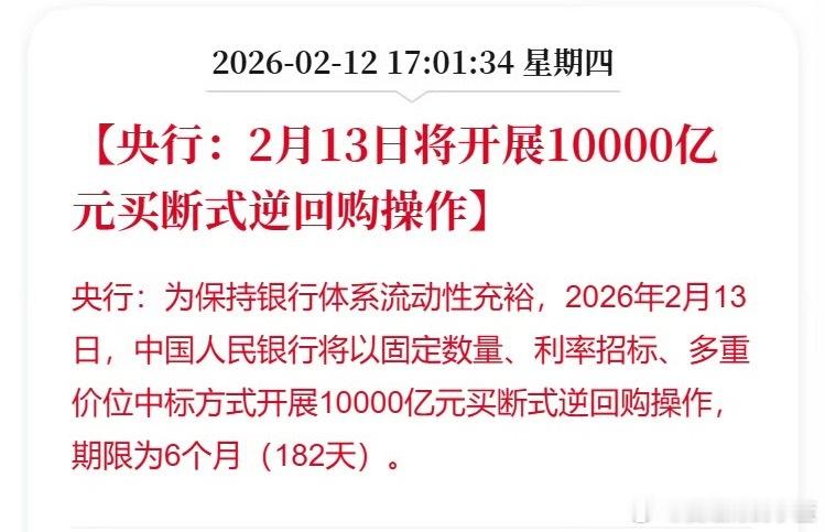 央行将开展10000亿逆回购操作央行:为保持银行体系流动性充裕,2026年2月13日,中国人民银行将以固定数量、利率招标、多重价位中标方式开展10000亿元买断式逆回购操作,期限为6个月(182天)。