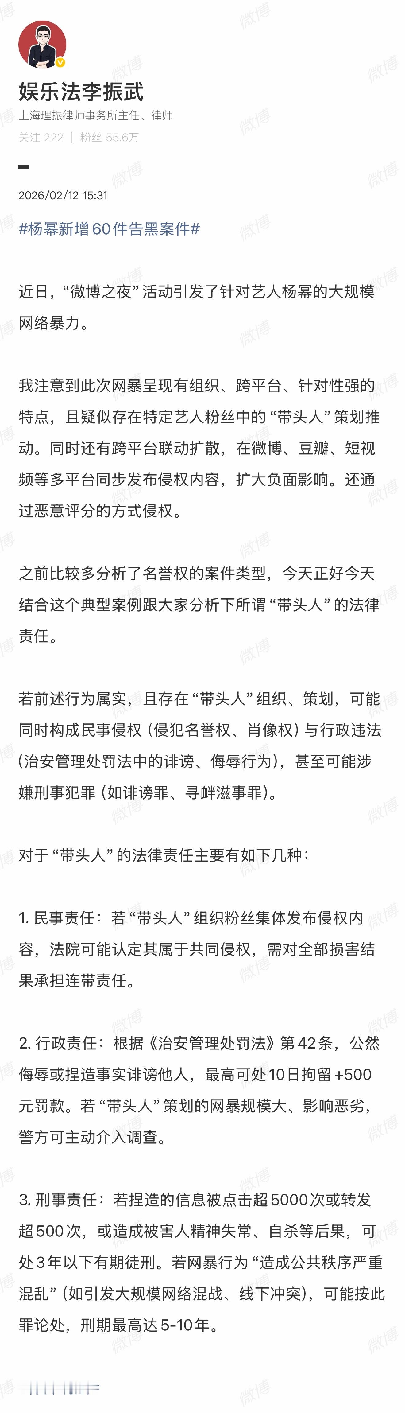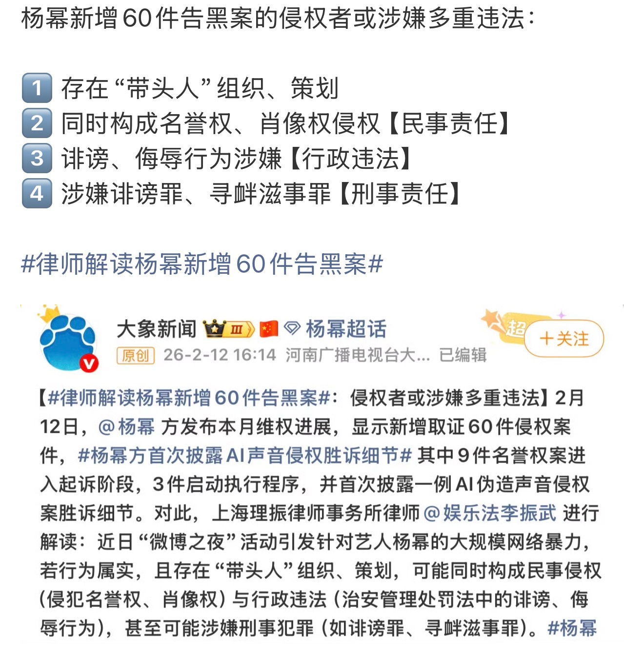 律师解读杨幂新增60件告黑案支持杨幂维权,不接受莫名其妙的嘿水“我注意到此次网暴呈现有组织、跨平台、针对性强的特点,且疑似存在特定艺人粉丝中的“带头人”策划推动。同时还有跨平台联动扩散,在微博、豆瓣、短视频等多平台同步发布侵权内容,扩大负面影响。”真的心疼杨幂!