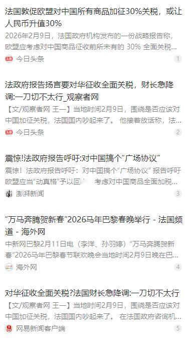 法国突抛重磅提议!欧盟对华全商品加征30%关税,还要逼人民币升值30%,中欧贸易格局要彻底变天? 麻烦看官老爷们右上角点击一下“关注”,既方便您进行讨论和分享,又能给您带来不一样的参与感,感谢您的支持! 2026 年 2 月 9 日,法国高等战略与规划委员会对外发布一份经贸政策报告,向欧盟提出两项极端对华经贸建议,迅速引发国际舆论热议。 报告建议欧盟对中国所有输欧商品统一加征 30% 关税,或推动欧元对人民币贬值 20% 至 30%,试图以此抹平中欧产业成本差距。 该报告将中国制造业技术升级与竞争力提升,定性为欧洲制造业面临的核心挑战,被视作欧盟对华 “去风险化” 进程中出现的激进信号。 报告内容并非空穴来风,而是法国部分政界与学界对中欧产业竞争加剧的集中反应,也是欧洲内部贸易保护情绪抬头的直观体现。 需要明确的是,这份提议目前仅为法国官方咨询机构的政策建议,并非欧盟官方立场,不具备直接法律效力与执行效力。 法国内部对此存在明显分歧,法国财长已公开降温,称不支持一刀切式全面关税,主张更有针对性的贸易平衡措施。 欧盟内部同样难以形成共识,德国、荷兰、意大利等国与中国产业链深度绑定,不愿因极端政策损害自身经贸利益。 从本质上看,该提议带有典型的贸易保护主义色彩,本质是部分欧洲国家试图转嫁内部经济与产业压力。 人民币汇率由中国以市场供求为基础、参考一篮子货币进行调节,绝不会接受任何外部单边施压与强制调整。 中国外交部与相关部门已明确表态,反对将经贸问题政治化,反对违背世贸组织规则的单边限制措施。 当前中欧经贸合作仍以互利共赢为主基调,双方在绿色能源、高端制造、农产品等领域有着广泛共同利益。 该激进提议短期内几乎不可能落地,既不符合欧盟整体利益,也违背全球化时代产业链分工的客观规律。 面对外部干扰,中国将继续坚持高水平对外开放,同时坚定维护自身产业安全与发展利益,推动中欧经贸关系平稳前行。