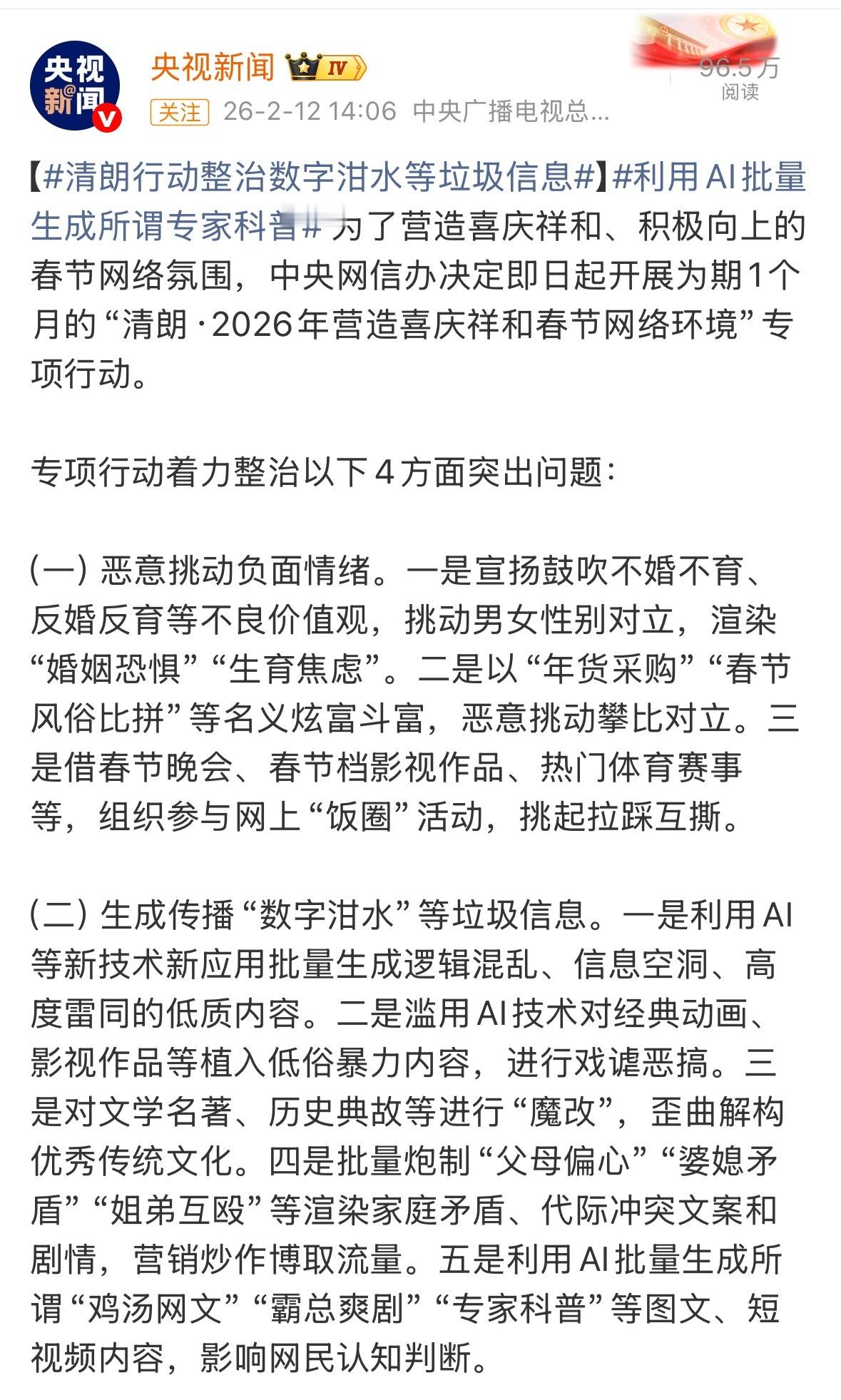 同时春节期间,网信办也在开展为期1月的清朗行动,特别点到恶意挑动负面情绪