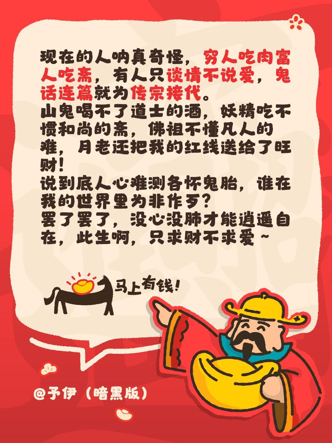 现在的人呐真奇怪,穷人吃肉富人吃斋,有人只谈情不说爱,鬼话连篇就为传宗接代。 山鬼喝不了道士的酒,妖精吃不惯和尚的斋,佛祖不懂凡人的难,月老还把我的红线送给了旺财! 说到底人心难测各怀鬼胎,谁在我的世界里为非作歹? 罢了罢了,没心没肺才能逍遥自在,此生啊,只求财不求爱~求财不求爱 谈钱很俗却很现实 吃斋饭 现在的人啊