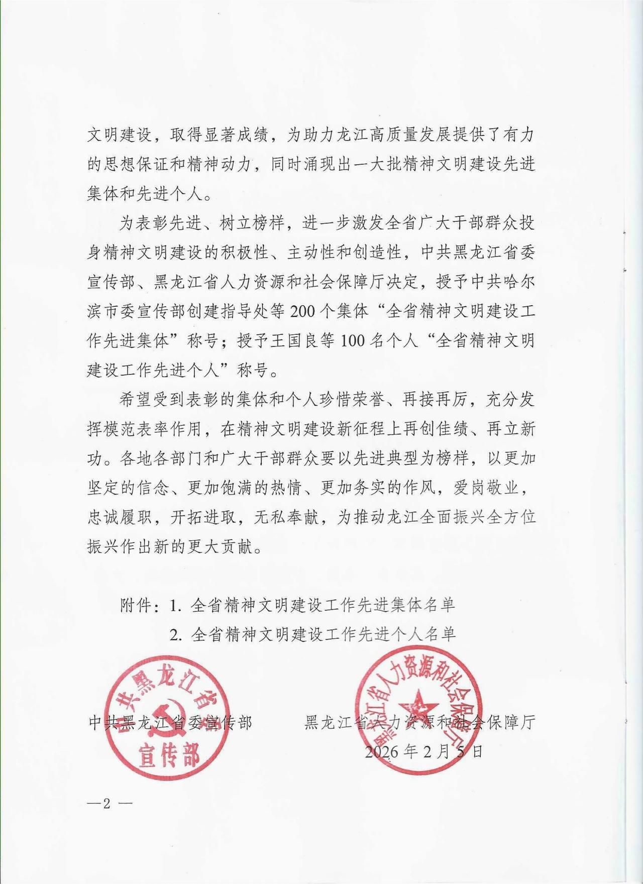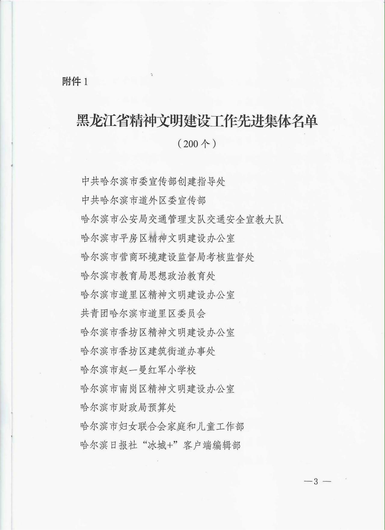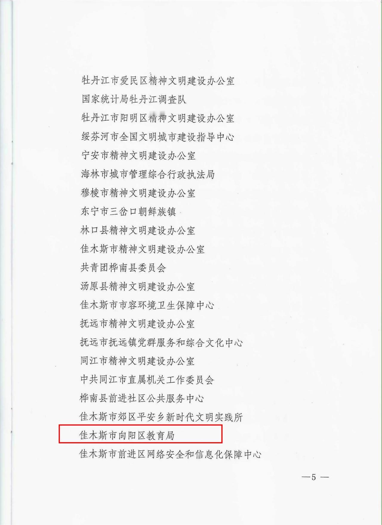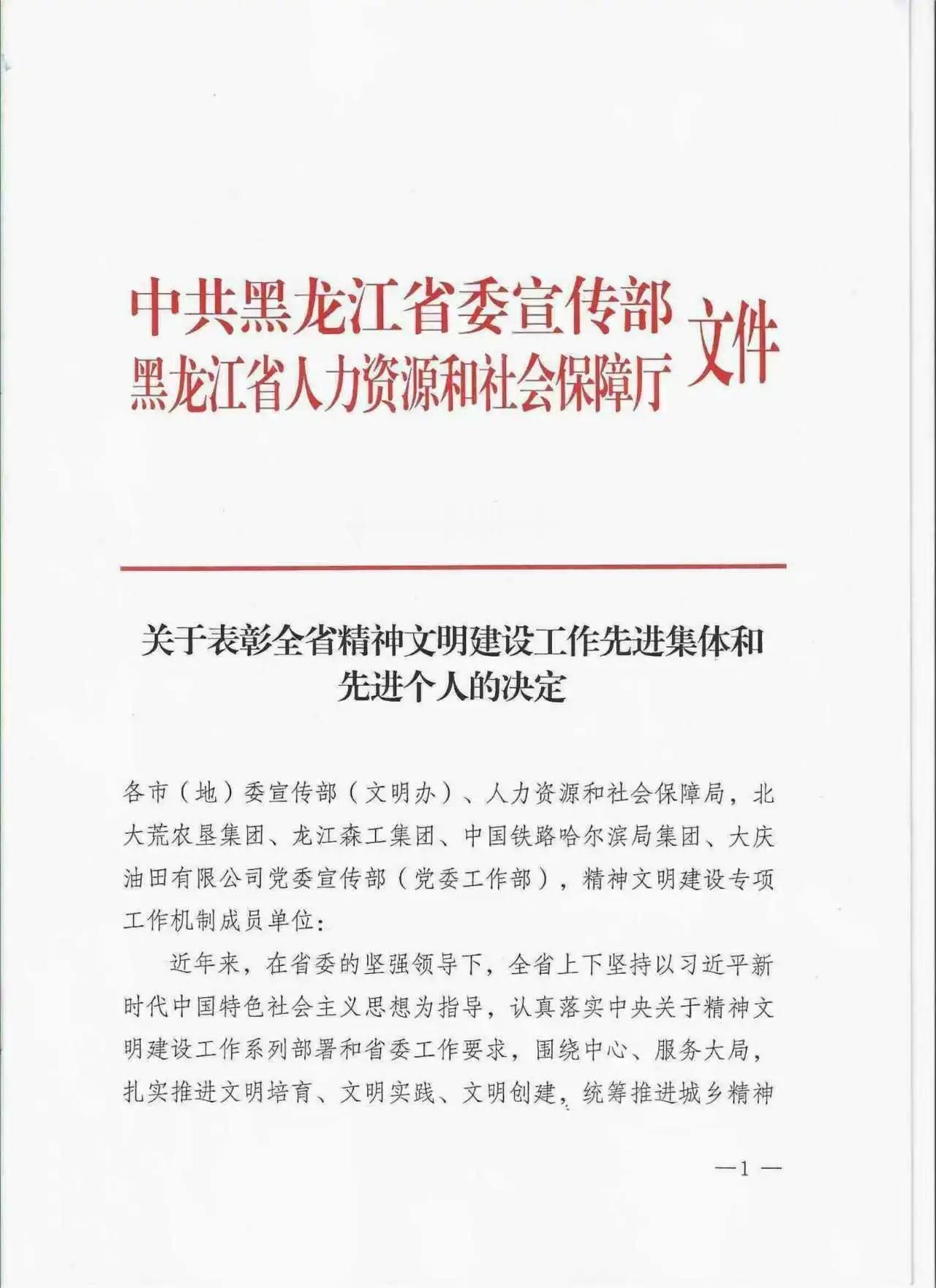 【喜报发布】向阳区教育局荣获黑龙江省精神文明建设工作先进集体称号 祝贺 近年来,在省委的坚强领导下,全省上下坚持以习近平新时代中国特色社会主义思想为指导,认真落实中央关于精神文明建设工作系列部署和省委工作要求,围绕中心、服务大局,扎实推进文明培育、文明实践、文明创建,统筹推进城乡精神文明建设,取得显著成绩,为助力龙江高质量发展提供了有力的思想保证和精神动力,同时涌现出一大批精神文明建设先进集体和先进个人。 为表彰先进、树立榜样,进一步激发全省广大干部群众投身精神文明建设的积极性、主动性和创造性,中共黑龙江省委宣传部、黑龙江省人力资源和社会保障厅决定,授予中共哈尔滨市委宣传部创建指导处等200个集体“全省精神文明建设工作先进集体”称号,其中,向阳区教育局荣获此称号。 来源:省委宣传部 省人力资源和社会保障厅 一审:张琦 二审:冯涵 三审:刘俣辛