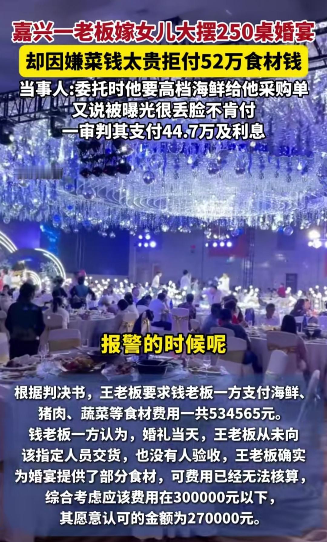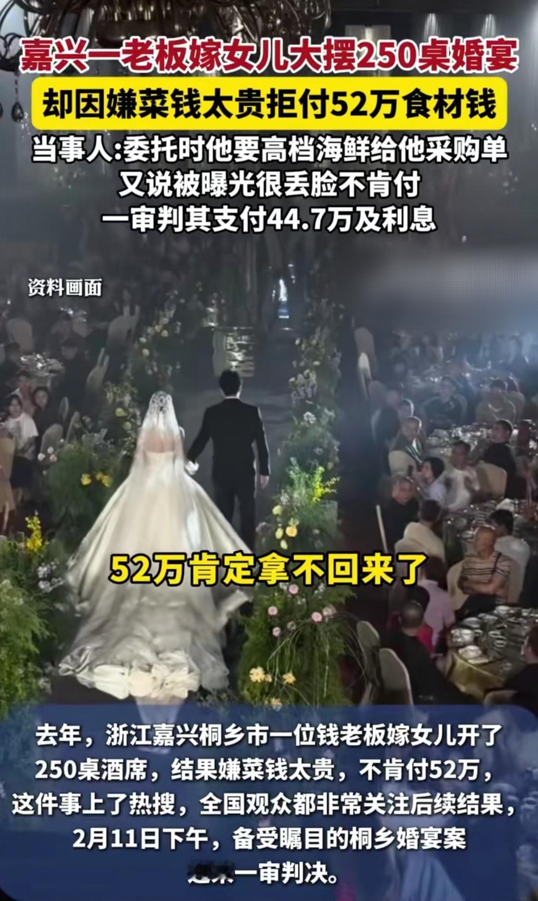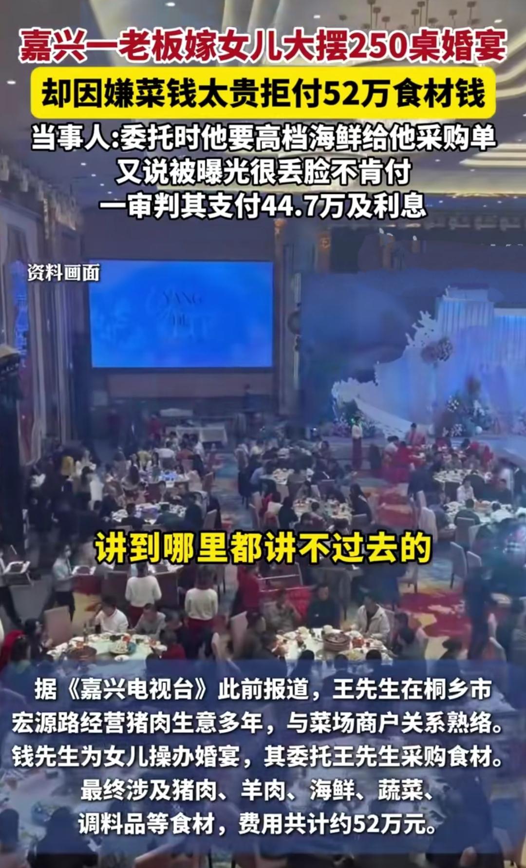 谁能想到一场风光的豪门婚宴,最后竟闹上法庭还撕破脸!浙江桐乡一位老板嫁女,大摆250桌婚宴超有排面,猪肉商老板好心垫资52万采买食材,现场也按要求验货,结果宴后付款环节直接翻车。 宴后猪肉商拿着53万多的账单要钱,这位老板却不认账了,直言海鲜价格虚高,只肯给27万,后续事情被曝光,老板觉得丢了脸面,干脆一分钱都不肯付,甚至把曝光的媒体告了,索赔12万多,双方彻底谈崩。 无奈之下猪肉商只能起诉,近日法院一审判决,酌定老板需付44.7万货款和利息,可双方都对这个金额不满意,老板大概率要上诉,猪肉商这边也在考虑是否上诉。说到底,这场纠纷只因没签书面采购协议,大额往来真的要留好凭证啊。