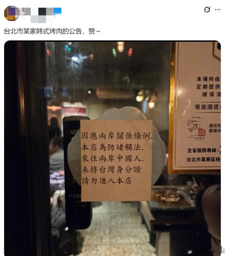 中国台湾省 台媒:“台北市万华区某韩式烤肉店张贴公告,称未持台湾身分证的中国人请勿进入,引发热议。”