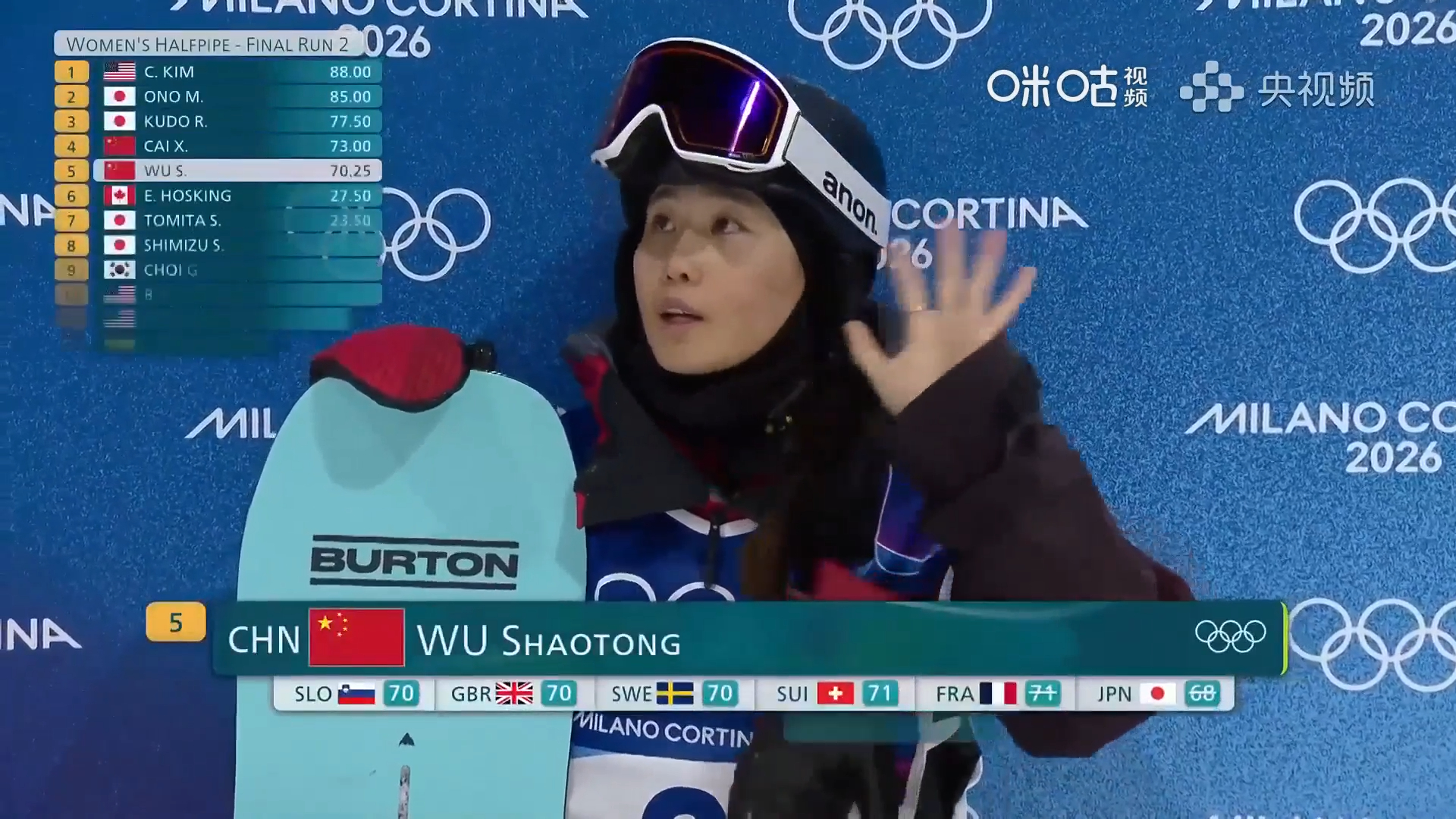 米兰冬奥会单板滑雪女子U型场地技巧决赛,🇨🇳第二滑成绩:70.25分。第三滑加油🎉