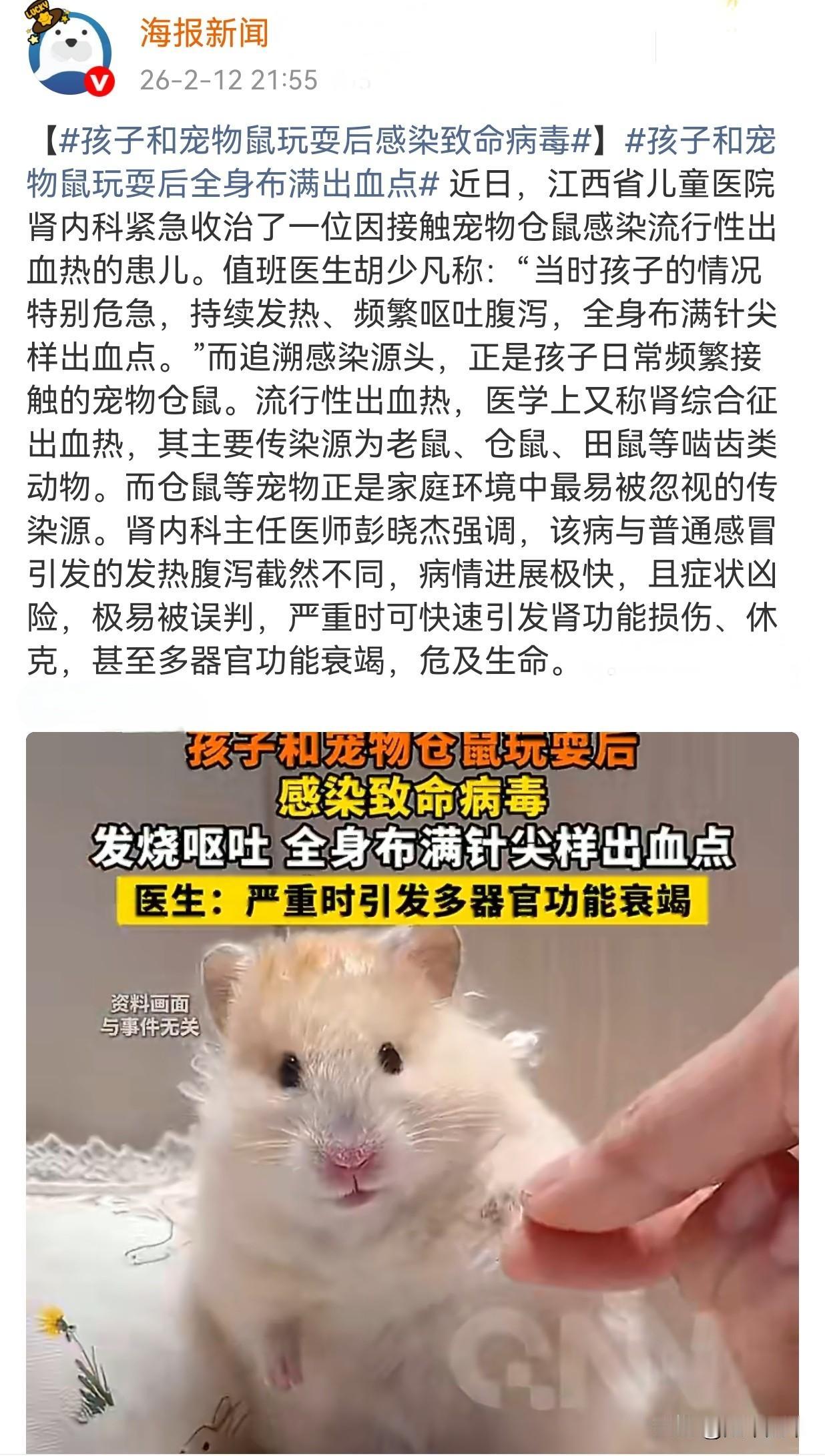 或许是过分忧虑了?异宠的事情很严重! 江西南昌一名儿童因接触家养仓鼠感染流行性出血热(汉坦病毒感染),出现持续高热、全身出血点及多器官衰竭等凶险症状,经抢救脱险。 目前我们对追求关注度有些变态,从而导致了对异宠追求的极端化。鹦鹉热、汉坦病毒。已经造成了多位饲主的问题。许多异宠(仓鼠、蜥蜴、鹦鹉、蛇等)可能是沙门氏菌、钩端螺旋体、鹦鹉热衣原体等病原体的天然宿主。饲主是通过接触宠物的排泄物、分泌物,或被咬伤、抓伤而感染。感染后可能导致腹泻、发热、肺炎等疾病,严重时甚至危及生命。 也许有一天敌对势力或许可以用这些东西进行病毒入侵。恳请大家为了自己和家人的安全平不要饲养异宠。