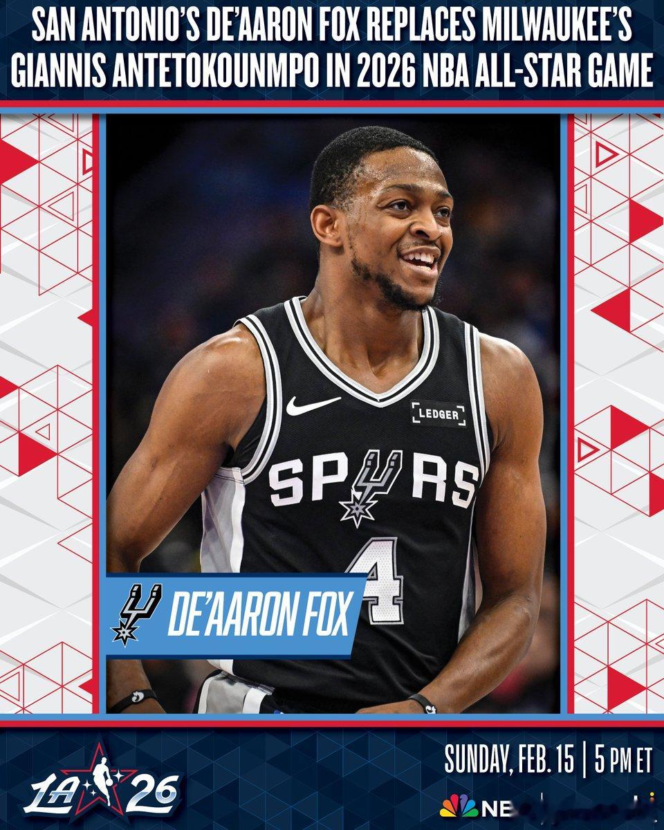 NBA总裁亚当-萧华宣布马刺后卫福克斯顶替受伤的字母哥参加全明星赛!
