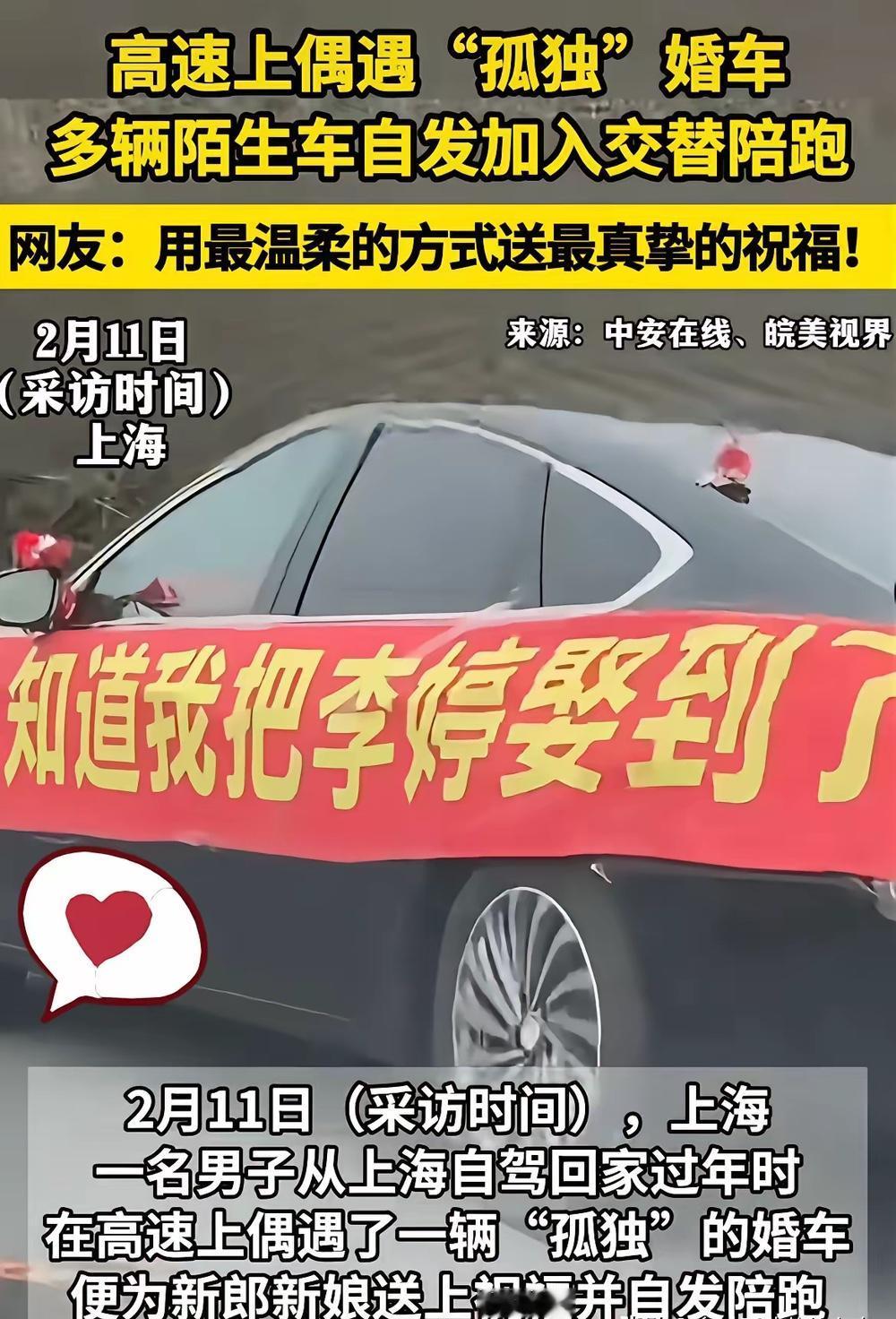 刷到那个叫李婷的新娘后续,说实话看得人心里挺不是滋味的。 一个人为了爱情远嫁,连个正经送亲的娘家车队都没有,这简直就是拿后半辈子在“裸赌”。 但这世上还真就是热心肠的人多! 高速上那一排排突然亮起的双闪,真的看得人起鸡皮疙瘩。原本孤零零的一辆婚车,愣是被一群素不相识的司机给包围了,大家自发组成了最硬核的“娘家人”,一路护送到服务区。 看着新郎新娘下车给大家发喜糖那一幕,太戳心了。 李婷是南方小城的姑娘,从小被父母捧在手心长大,大学毕业后在外地打工,遇上了现在的新郎。两人相恋三年,感情一直安稳,可两家相隔一千多公里,娘家父母从一开始就反对这门亲事,不是嫌弃男方家境,而是舍不得独生女远嫁,怕她受了委屈连个倾诉的亲人都没有。 李婷认准了新郎的真心,执意要奔赴这场异地婚姻。婚礼筹备时,娘家亲戚大多觉得路途太远,不愿奔波随行,父母又因身体原因无法承受长途车程,最终送亲的只有她一个从小玩到大的发小。婚车是新郎简单租来的,没有气派的车队,没有热闹的送亲锣鼓,上高速的那一刻,李婷看着空荡的后方,鼻子一直发酸,连婚纱都被悄悄打湿了一角。 她不是不想要体面的婚礼,只是愿意为了爱情放下所有外在的排场,可这份孤注一掷的选择,终究让她藏着满心的忐忑。远嫁本就是一场豪赌,没有娘家车队撑腰,没有亲人围在身边,她就像独自背着行囊奔赴未知的旅人,连自己都不确定,这份选择到底值不值得。 高速上的司机们大多是常年跑运输的货车师傅,或是自驾出行的普通路人,他们没有提前商量,更没有任何利益牵扯,只是看到这辆孤零零贴满喜字的婚车,就猜到了姑娘远嫁的窘迫。一辆货车先亮起了双闪,紧接着小轿车、大巴车纷纷跟上,长长的车流用灯光围成了最坚固的护送队伍,没有喇叭喧哗,只有默默的陪伴,这是普通人最直白也最滚烫的善意。 李婷起初还没反应过来,直到看着后视镜里连绵的双闪灯光,才明白这些陌生人是在为自己送亲。她趴在车窗边哭了好久,不是委屈,是被突如其来的温暖砸中了心底最软的地方。她以为远嫁会是孤身一人,却没想到素不相识的路人,会给她撑起最有排面的“娘家人”阵仗。 新郎也全程红着眼,他知道妻子心里的遗憾,更感激这些陌生人的温柔。到了服务区后,两人捧着提前准备好的喜糖,挨个给每一位司机递糖道谢,没有华丽的言辞,只有深深的鞠躬,一颗小小的喜糖,裹着新人的欢喜,也装着对陌生人的满心感恩。 我们总说远嫁是女生最大的勇敢,可这份勇敢背后,藏着太多的不舍与不安。李婷的故事之所以戳中无数人,就是因为我们都懂,一个姑娘舍弃故土、奔赴爱情的不易,也庆幸这世间总有不期而遇的温暖,能抚平那些藏在心底的落寞,能给每一份真心,配上最值得的温柔。 各位读者你们怎么看?欢迎在评论区讨论。