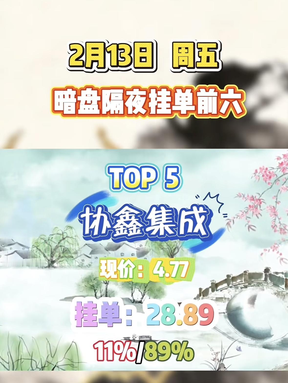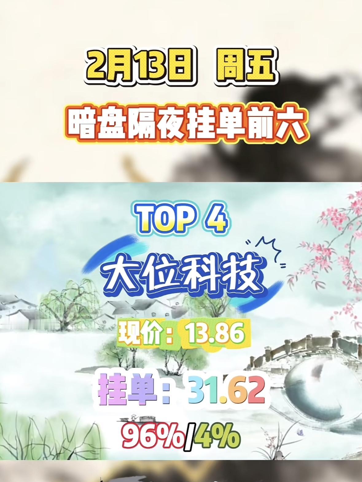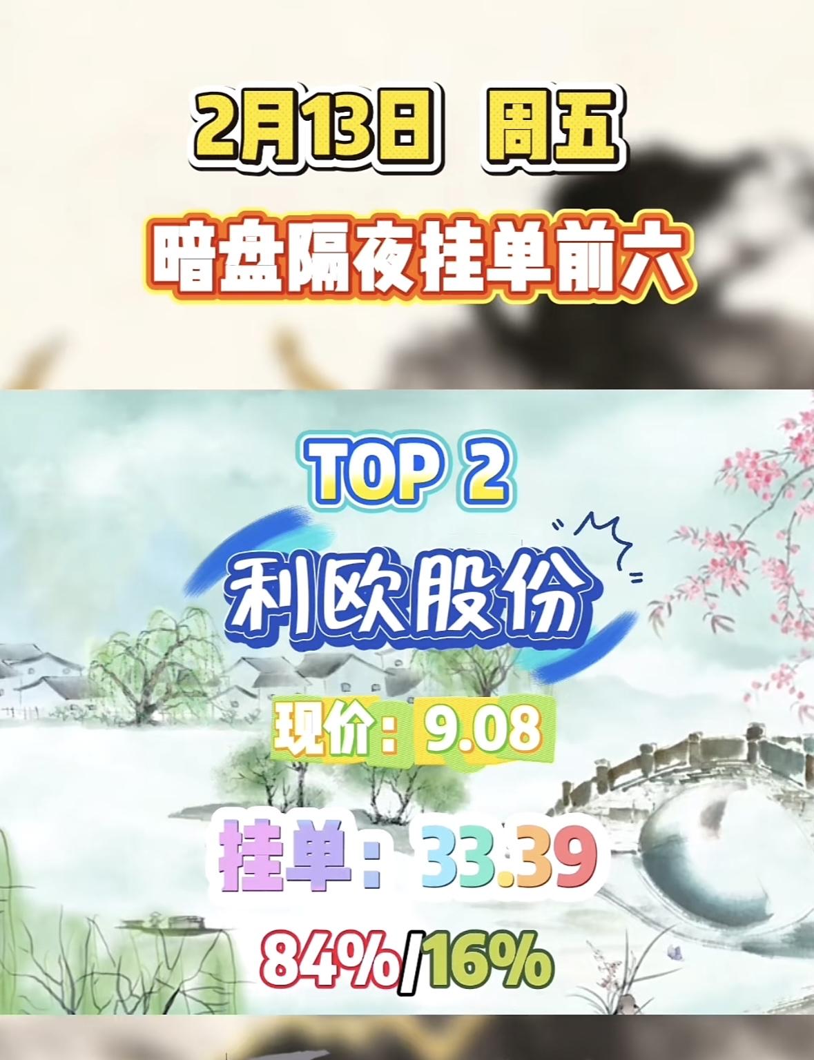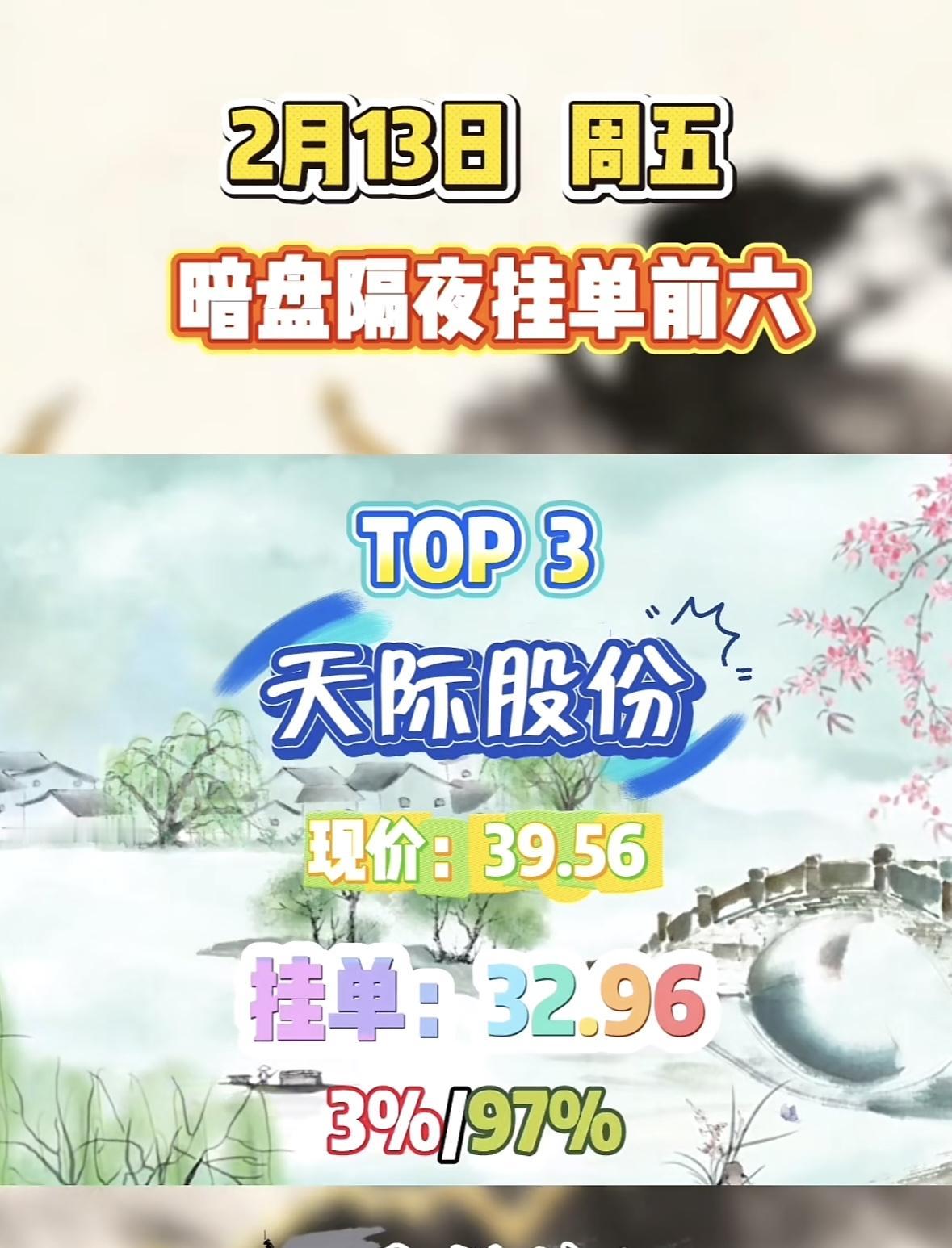 2月13日暗盘隔夜挂单前六名揭晓! 嘉美包装暗盘交投活跃,挂单占比高,市场热度攀升,现价表现亮眼,投资者关注度持续升温。