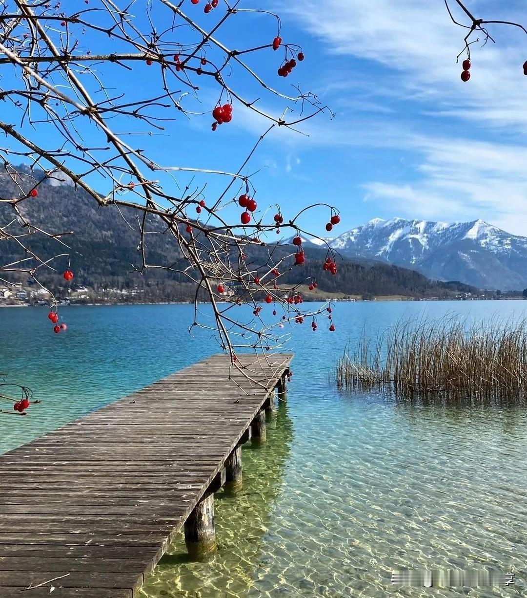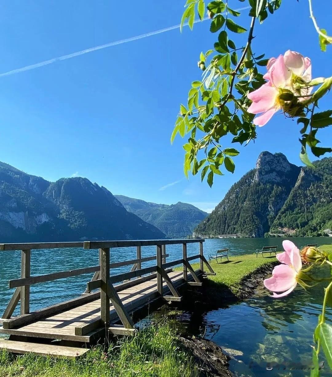 湖畔木栈道,山间野花盛开,静享自然之美。