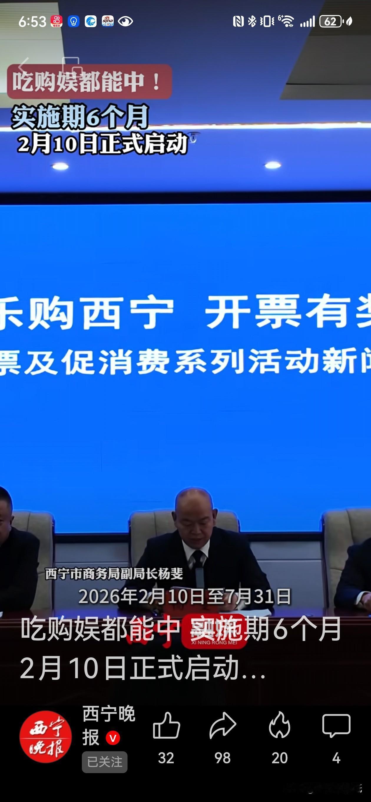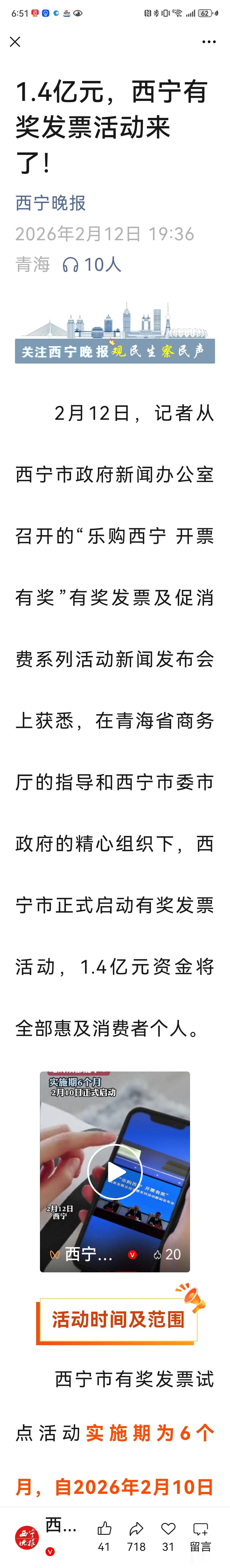 西宁人注意!只要是买了东西的发票,别扔!上传就能抽奖,1.4亿奖金等着你! 天大的好事儿砸下来了!从今往后,吃完饭、逛完超市、加完油,那张发票可千万别随手扔了! 那不是纸,那是钱啊! 官方刚刚宣布,1.4个亿的现金大奖,专门发给西宁购物爱开发票的老百姓!只要你手里有2月10号以后、满100块钱的发票,动动手指头传上去,就能抽奖! 记得,西宁市有奖发票试点活动实施期为6个月,自2026年2月10日至7月31日结束。 没那些虚头巴脑的,全是硬通货!“即时开奖”,20、50、80、100块直接塞你兜里;“定期抽大奖”更狠,200、500、800块现金直接打到你银行卡上! 最良心的是啥?一张发票能中两次! 这边刚刮完即开奖,那边还能再参加月度大抽奖,相当于一张票给你两次中奖机会,这概率,不去试试都觉得自己亏了! 咋操作?简单得很! 现在就掏出手机,打开云闪付,找到“有奖发票”专区,咔嚓一拍上传就完事!过两天支付宝也能搞,哪个顺手用哪个。 2月13号起就能传! 先把月初那几天花的钱翻出来,10号到28号的发票全传上去,3月1号统一兑奖。 还有,3月3号元宵节第一轮“大抽奖”就开奖,那可是800块!手头有发票的赶紧去碰碰运气,万一中了呢? 别嫌麻烦,这一拍可能就是一星期的菜钱!赶紧告诉家里掌柜的! 记录我的2026