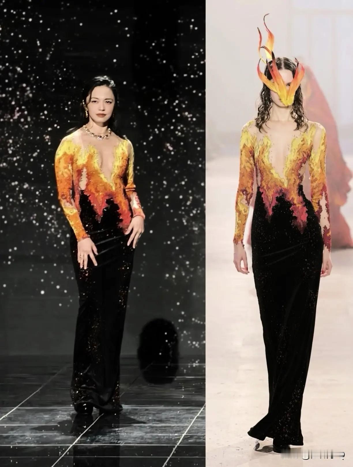 姚晨的火焰礼服真的太不能遮肉了,溜肩还显手臂粗。要是礼服上半身改成黑色,下半身换成火焰,那效果就比较适合姚晨。黑色遮肉,姚晨腿细,把效果集中在腿上突出优势。